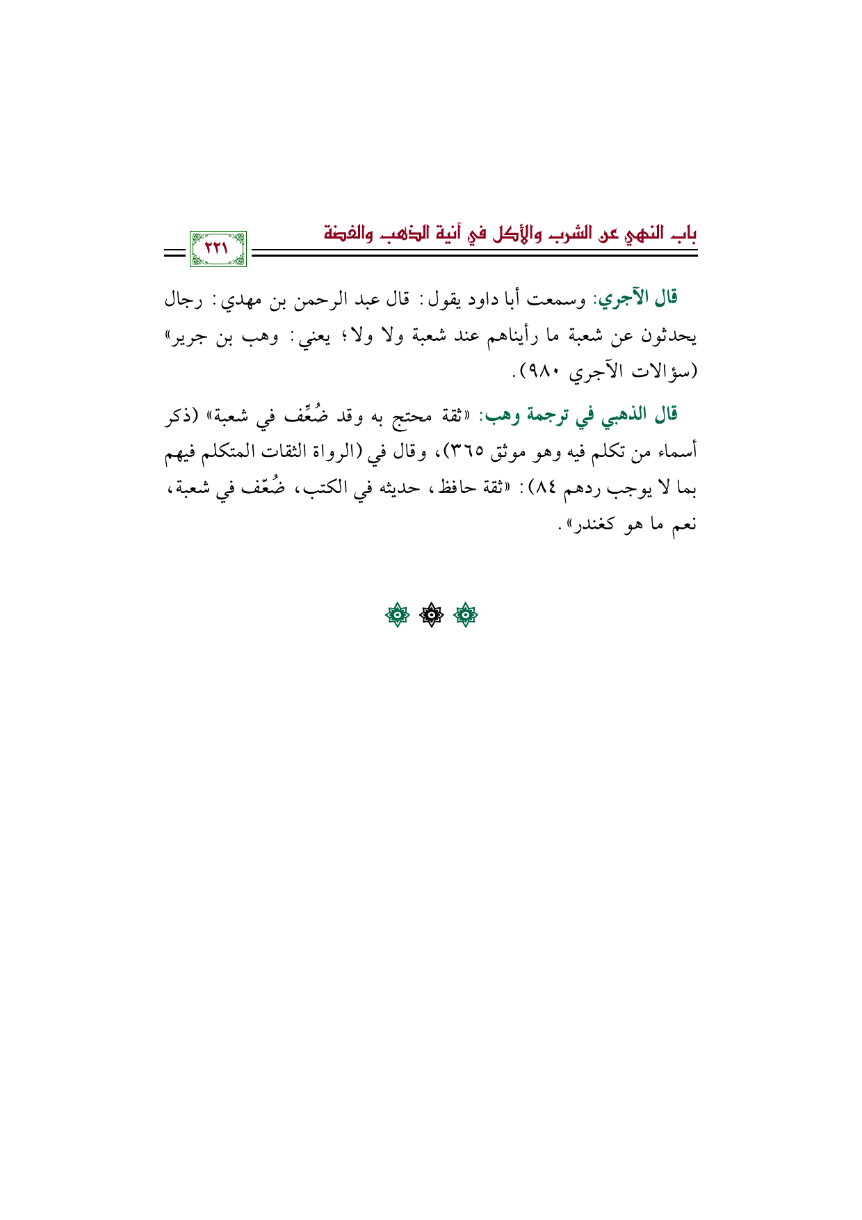 قال الآجري: وسمعت أبا داود يقول: قال عبد الرحمن بن مهدي: رجال يحدثون عن شعبة ما رأيناهم عند شعبة ولا ولا؛ يعني: وهب بن جرير)) (سؤالات الآجري ٩٨٠).