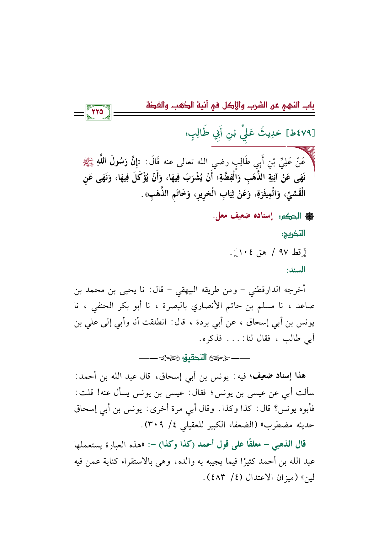 أخرجه الدارقطني - ومن طريقه البيهقي - قال: نا يحيى بن محمد بن صاعد، نا مسلم بن حاتم الأنصاري بالبصرة، نا أبو بكر الحنفي، نا يونس بن أبي إسحاق، عن أبي بردة، قال: انطلقت أنا وأبي إلى علي بن أبي طالب، فقال لنا: ... فذكره.