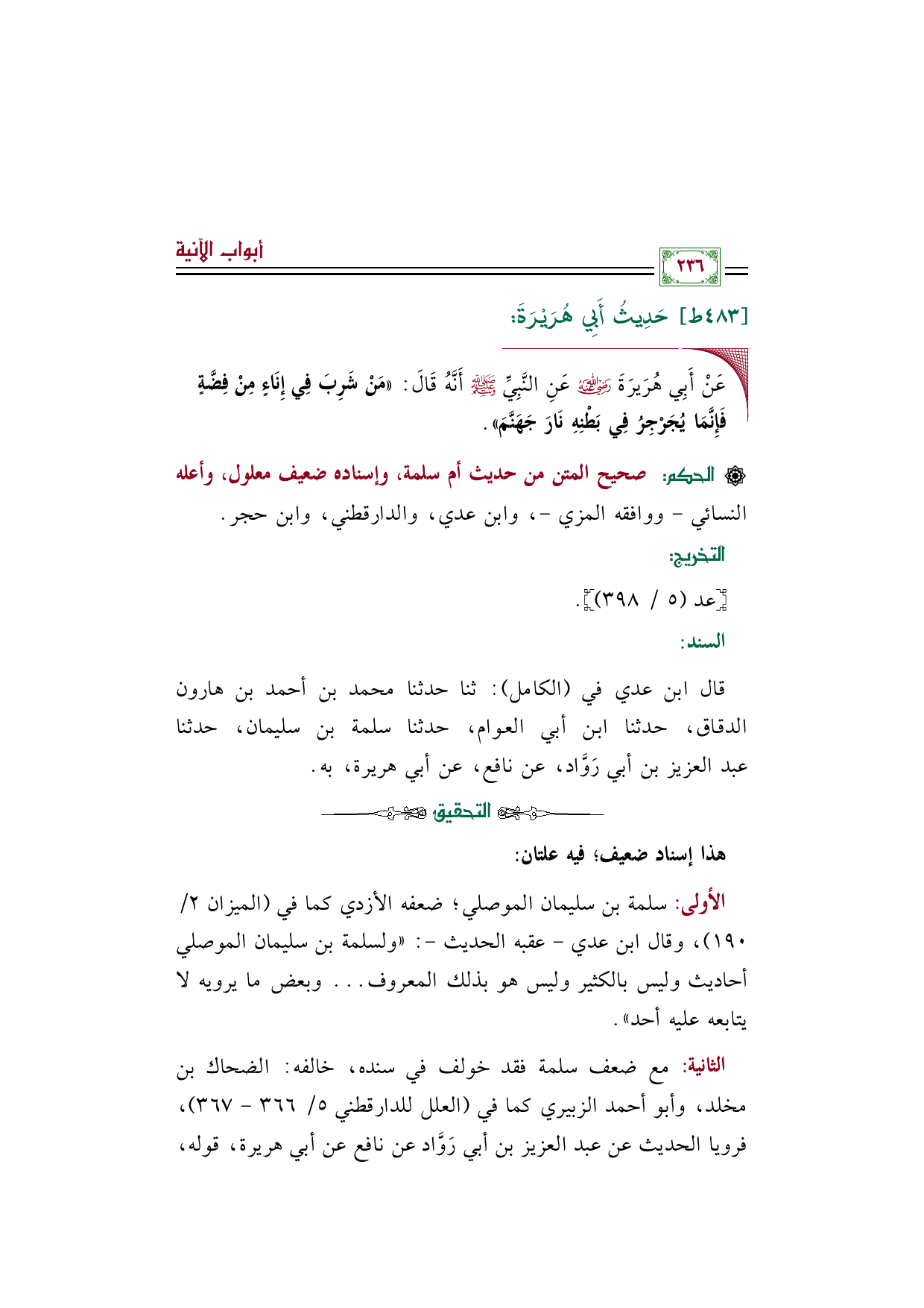 الثانية: مع ضعف سلمة فقد خولف في سنده، خالفه: الضحاك بن مخلد، وأبو أحمد الزبيري كما في (العلل للدارقطني ٥/ ٣٦٦ - ٣٦٧)، فرويا الحديث عن عبد العزيز بن أبي رَوَّاد عن نافع عن أبي هريرة، قوله،
