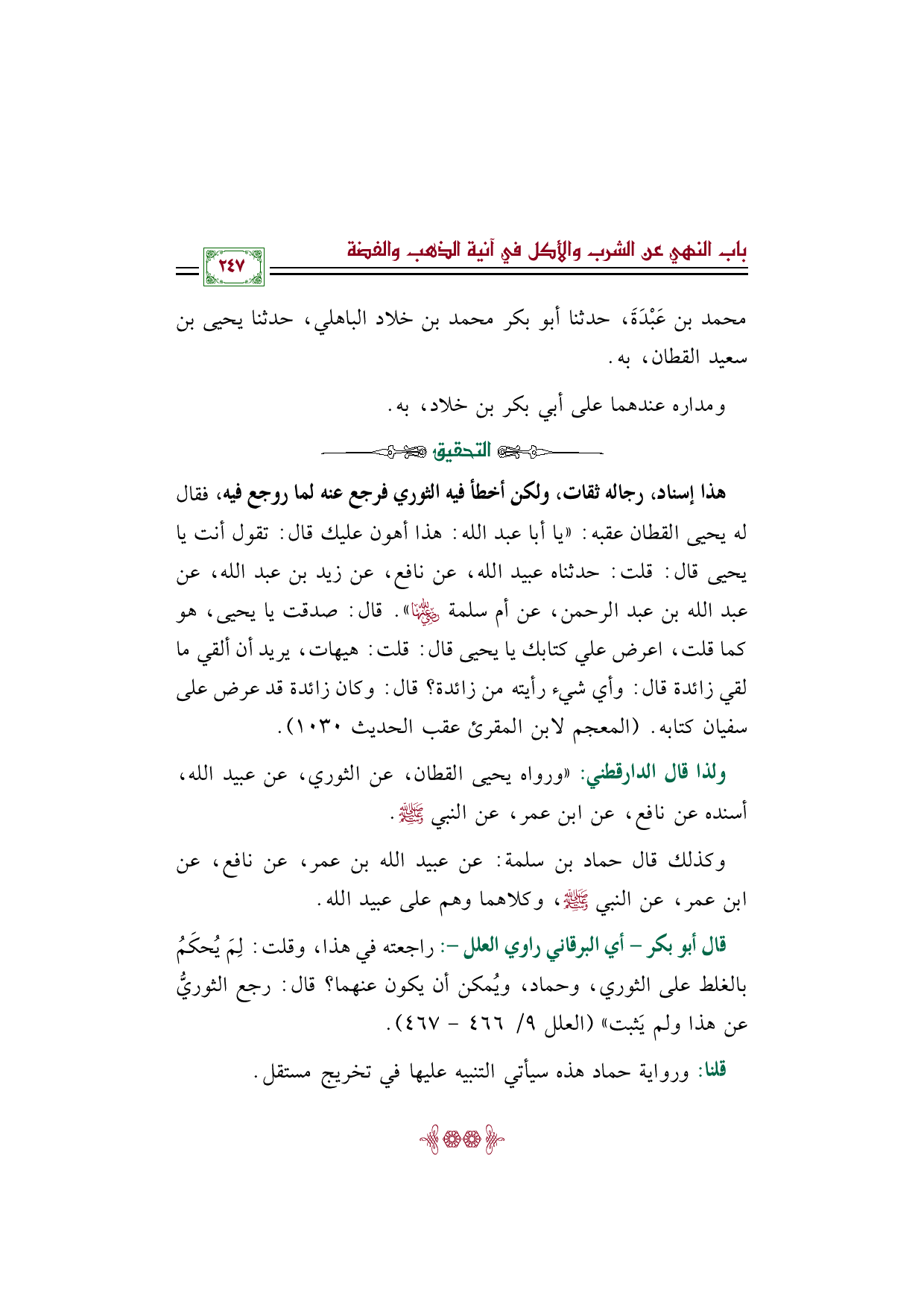 قال أبو بكر - أي البرقاني راوي العلل -: راجعته في هذا، وقلت: لِمَ يُحكَمُ بالغلط على الثوري، وحماد، ويُمكن أن يكون عنهما؟ قال: رجع الثوريُّ عن هذا ولم يَثبت)) (العلل ٩/ ٤٦٦ - ٤٦٧).