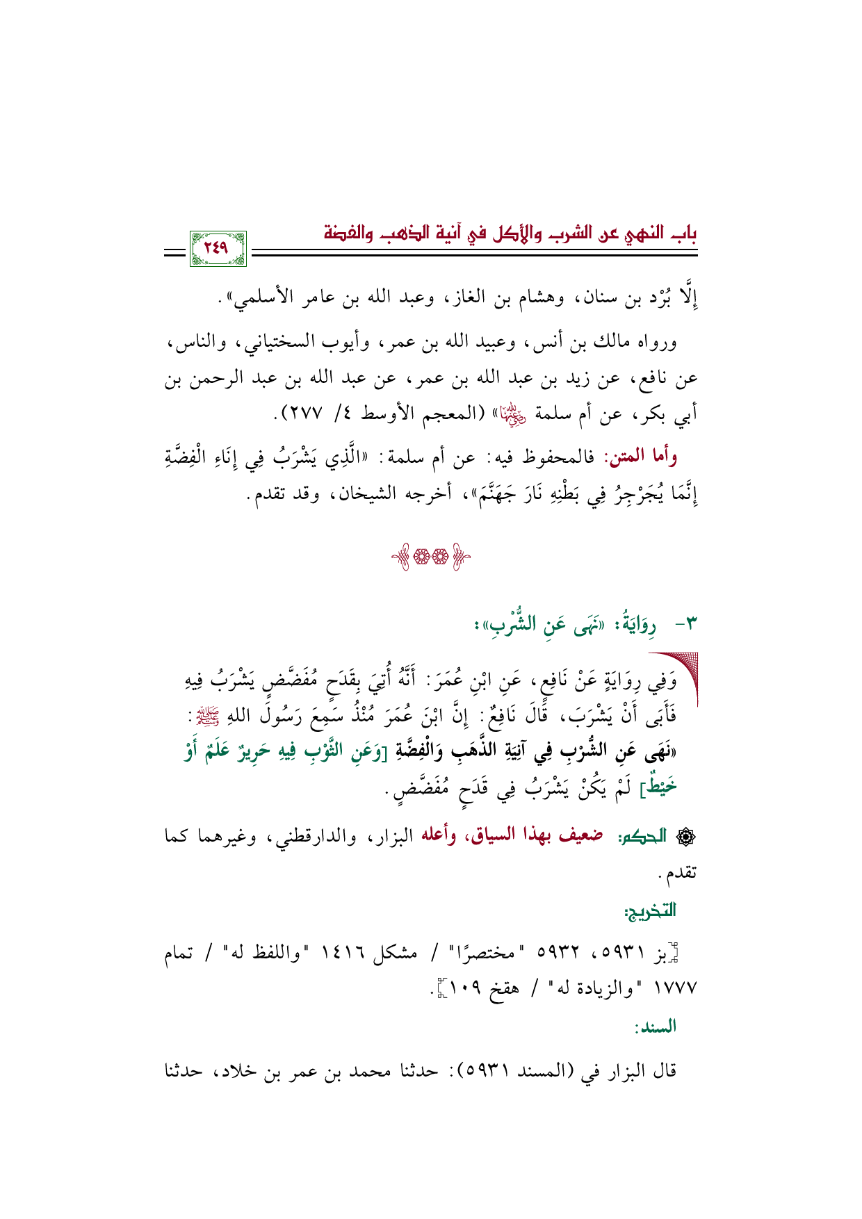 وأما المتن: فالمحفوظ فيه: عن أم سلمة: ((الَّذِي يَشْرَبُ فِي إِنَاءِ الْفِضَّةِ إِنَّمَا يُجَرْجِرُ فِي بَطْنِهِ نَارَ جَهَنَّمَ))، أخرجه الشيخان، وقد تقدم.