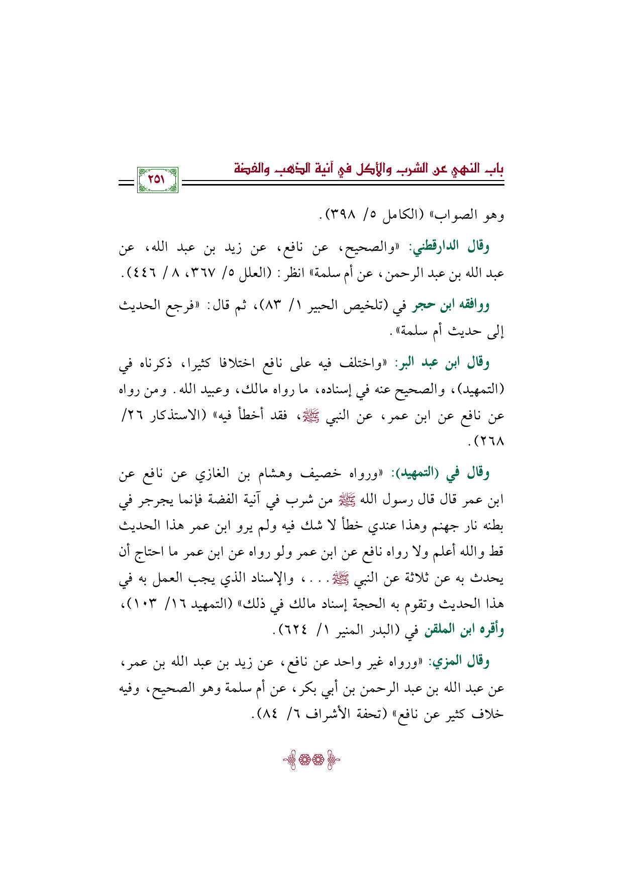 وقال في (التمهيد): ((ورواه خصيف وهشام بن الغازي عن نافع عن ابن عمر قال قال رسول الله صلى الله عليه وسلم من شرب في آنية الفضة فإنما يجرجر في بطنه نار جهنم وهذا عندي خطأ لا شك فيه ولم يرو ابن عمر هذا الحديث قط والله أعلم ولا رواه نافع عن ابن عمر ولو رواه عن ابن عمر ما احتاج أن يحدث به عن ثلاثة عن النبي صلى الله عليه وسلم ... ، والإسناد الذي يجب العمل به في هذا الحديث وتقوم به الحجة إسناد مالك في ذلك)) (التمهيد ١٦/ ١٠٣)، وأقره ابن الملقن في (البدر المنير ١/ ٦٢٤).