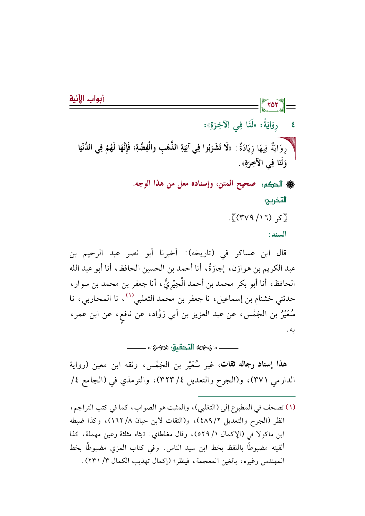 قال ابن عساكر في (تاريخه): أخبرنا أبو نصر عبد الرحيم بن عبد الكريم بن هوازن، إجازةً، أنا أحمد بن الحسين الحافظ، أنا أبو عبد الله الحافظ، أنا أبو بكر محمد بن أحمد الْحِيْرِيُّ، أنا جعفر بن محمد بن سوار، حدثني خشنام بن إسماعيل، نا جعفر بن محمد الثعلبي (¬١)، نا المحاربي، نا سُعَيْرُ بن الخِمْس، عن عبد العزيز بن أبي رَوَّاد، عن نافعٍ، عن ابن عمر، به.