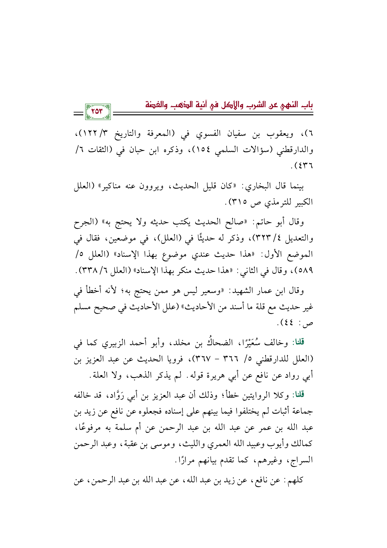 قلنا: وخالف سُعَيْرًا، الضحاكُ بن مخلد، وأبو أحمد الزبيري كما في (العلل للدارقطني ٥/ ٣٦٦ - ٣٦٧)، فرويا الحديث عن عبد العزيز بن أبي رواد عن نافع عن أبي هريرة قوله. لم يذكر الذهب، ولا العلة.
