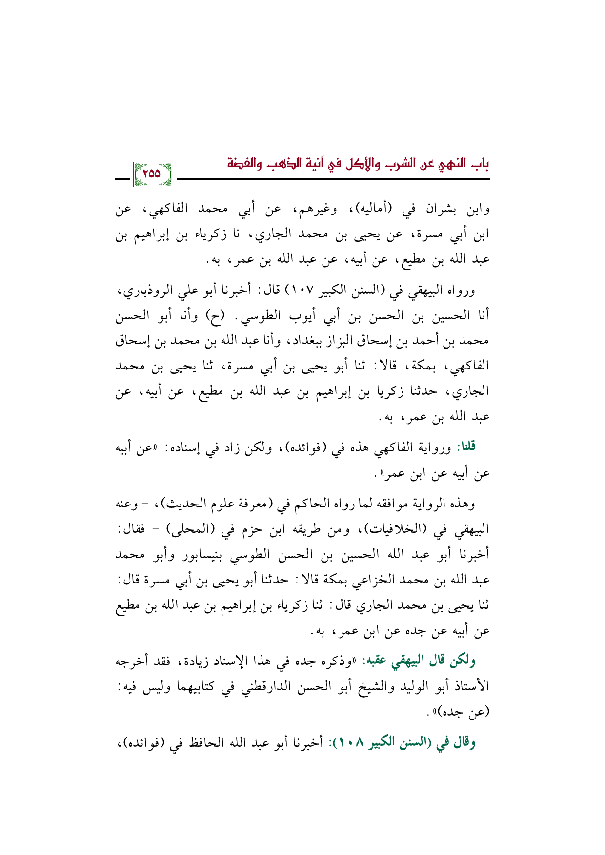 ورواه البيهقي في (السنن الكبير ١٠٧) قال: أخبرنا أبو علي الروذباري، أنا الحسين بن الحسن بن أبي أيوب الطوسي. (ح) وأنا أبو الحسن محمد بن أحمد بن إسحاق البزاز ببغداد، وأنا عبد الله بن محمد بن إسحاق الفاكهي، بمكة، قالا: ثنا أبو يحيى بن أبي مسرة، ثنا يحيى بن محمد الجاري، حدثنا زكريا بن إبراهيم بن عبد الله بن مطيع، عن أبيه، عن عبد الله بن عمر، به.