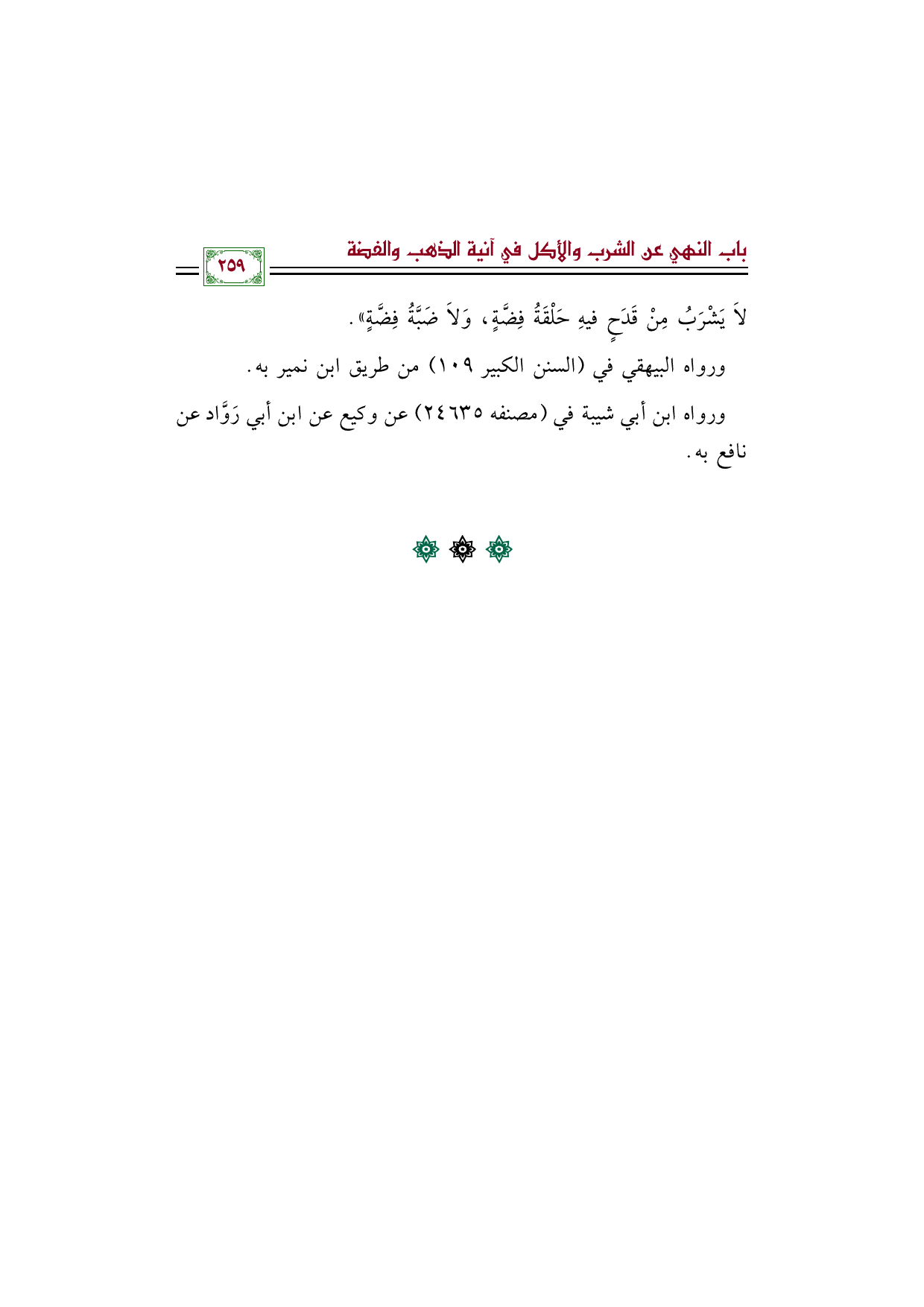 لا يَشْرَبُ مِنْ قَدَحٍ فيهِ حَلْقَةُ فِضَّةٍ، وَلا ضَبَّةُ فِضَّةٍ)).