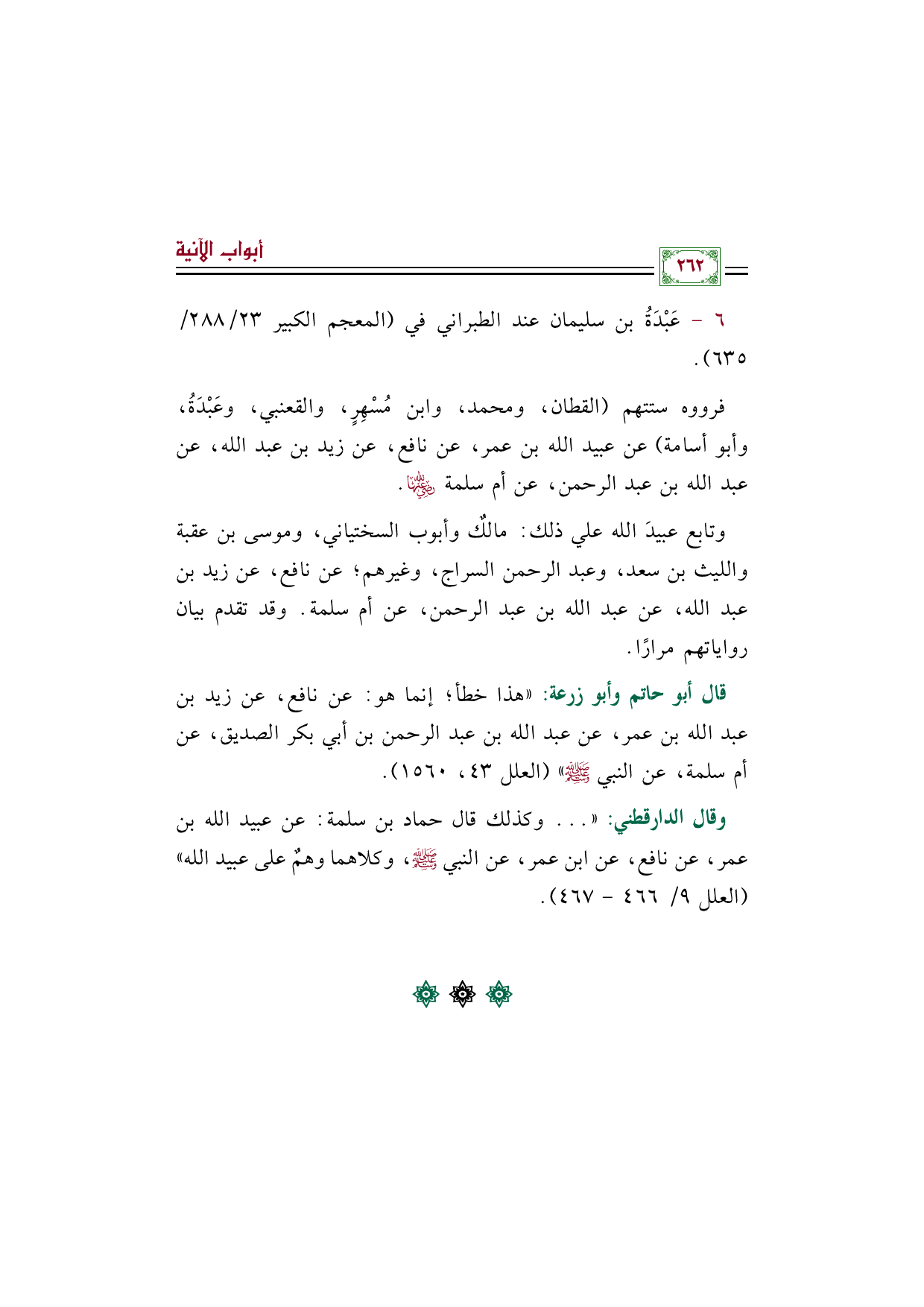 فرووه ستتهم (القطان، ومحمد، وابن مُسْهِرٍ، والقعنبي، وعَبْدَةُ، وأبو أسامة) عن عبيد الله بن عمر، عن نافع، عن زيد بن عبد الله، عن عبد الله بن عبد الرحمن، عن أم سلمة رضي الله عنها.