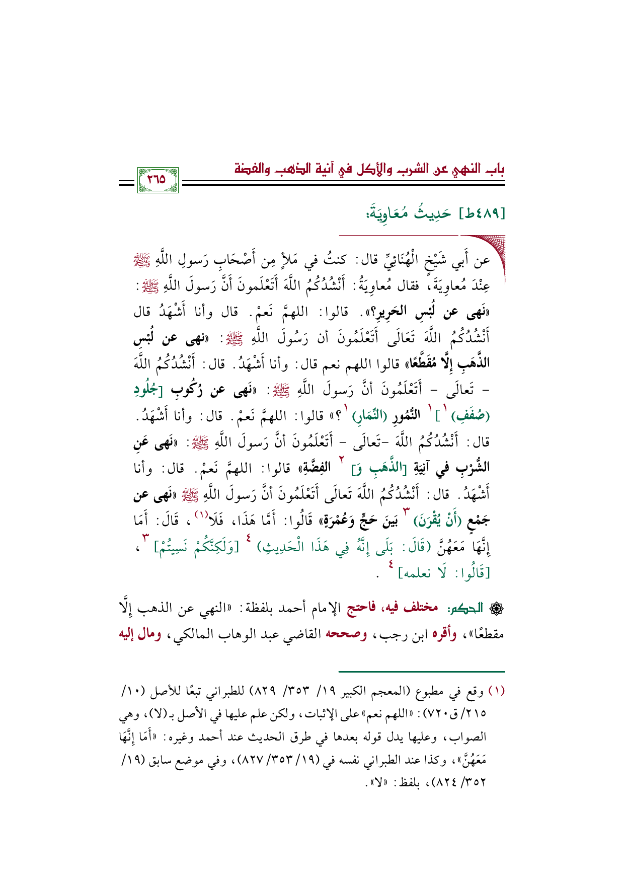 ◼ عن أَبي شَيْخٍ الْهُنَائِيِّ قال: كنتُ في مَلأٍ مِن أَصْحَابِ رَسولِ اللَّهِ صلى الله عليه وسلم عِنْدَ مُعاوِيَةَ، فقال مُعاوِيَةُ: أَنْشُدُكُمُ اللَّهَ أَتَعْلَمونَ أَنَّ رَسولَ اللَّهِ صلى الله عليه وسلم: ((نَهى عن لُبْسِ الحَرِيرِ؟ )). قالوا: اللهمَّ نَعمْ. قال وأنا أَشْهَدُ قال أَنْشُدُكُمُ اللَّهَ تَعَالَى أَتَعْلَمُونَ أن رَسُولَ اللَّهِ صلى الله عليه وسلم: ((نهى عن لُبْسِ الذَّهَبِ إِلَّا مُقَطَّعًا)) قالوا اللهم نعم قال: وأنا أَشْهَدُ. قال: أَنْشُدُكُمُ اللَّهَ - تَعالَى - أَتَعْلَمُونَ أنَّ رَسولَ اللَّهِ صلى الله عليه وسلم: ((نَهى عن رُكُوبِ] جُلُودِ (صُفَفِ) ١ [١ النُّمُورِ (النِّمَارِ) ٢؟ )) قالوا: اللهمَّ نَعمْ. قال: وأنا أَشْهَدُ. قال: أَنْشُدُكُمُ اللَّهَ -تَعالَى - أَتَعْلَمُونَ أنَّ رَسولَ اللَّهِ صلى الله عليه وسلم: ((نَهى عَنِ الشُّرْبِ في آنِيَةِ] الذَّهَبِ وَ [٢ الفِضَّةِ)) قالوا: اللهمَّ نَعمْ. قال: وأنا أَشْهَدُ. قال: أَنْشُدُكُمُ اللَّهَ تَعالَى أَتَعْلَمُونَ أنَّ رَسولَ اللَّهِ صلى الله عليه وسلم ((نَهى عن جَمْعٍ (أَنْ يُقْرَنَ) ٣ بَينَ حَجٍّ وَعُمْرَةٍ)) قَالُوا: أَمَّا هَذَا، فَلَا (¬١)، قَالَ: أَمَا إِنَّهَا مَعَهُنَّ (قَالَ: بَلَى إِنَّهُ فِي هَذَا الْحَدِيثِ) ٤ [وَلَكِنَّكُمْ نَسِيتُمْ [٣، ] قَالُوا: لَا نعلمه] ٤.