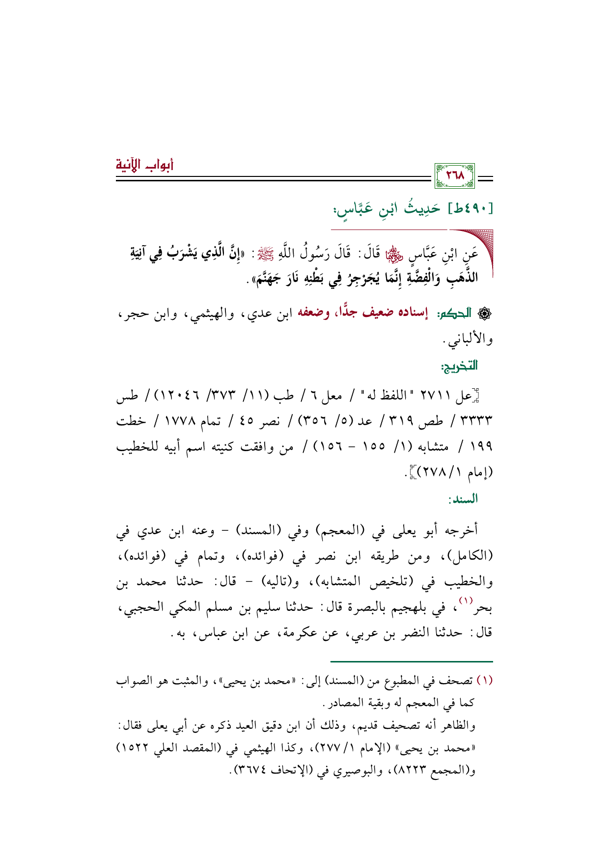 أخرجه أبو يعلى في (المعجم) وفي (المسند) - وعنه ابن عدي في (الكامل)، ومن طريقه ابن نصر في (فوائده)، وتمام في (فوائده)، والخطيب في (تلخيص المتشابه)، و (تاليه) - قال: حدثنا محمد بن بحر (¬١)، في بلهجيم بالبصرة قال: حدثنا سليم بن مسلم المكي الحجبي، قال: حدثنا النضر بن عربي، عن عكرمة، عن ابن عباس، به.