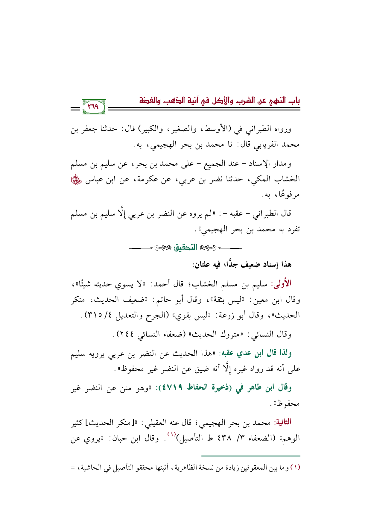 الثانية: محمد بن بحر الهجيمي؛ قال عنه العقيلي: (([منكر الحديث] كثير الوهم)) (الضعفاء ٣/ ٤٣٨ ط التأصيل) (¬١) . وقال ابن حبان: ((يروي عن