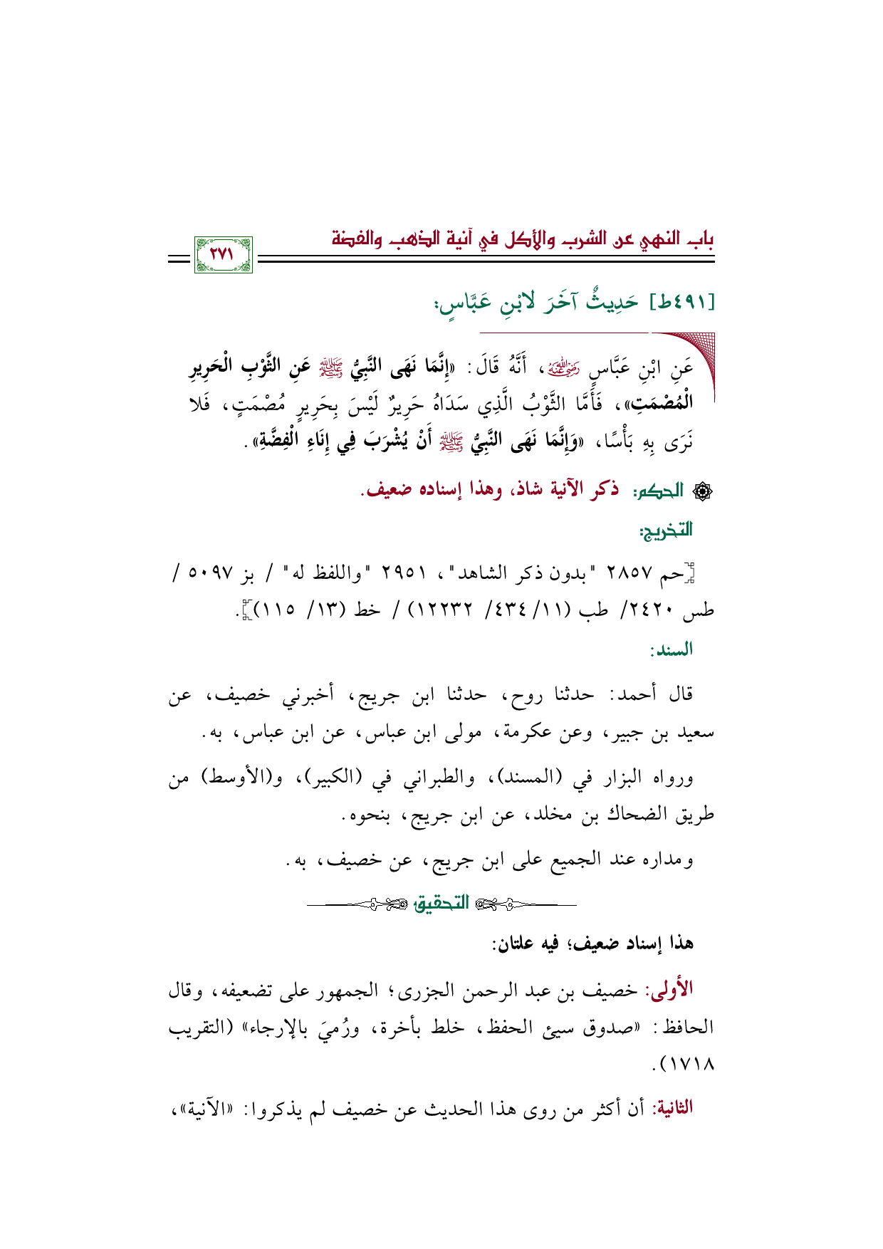 الأولى: خصيف بن عبد الرحمن الجزرى؛ الجمهور على تضعيفه، وقال الحافظ: ((صدوق سيئ الحفظ، خلط بأخرة، ورُميَ بالإرجاء)) (التقريب ١٧١٨).