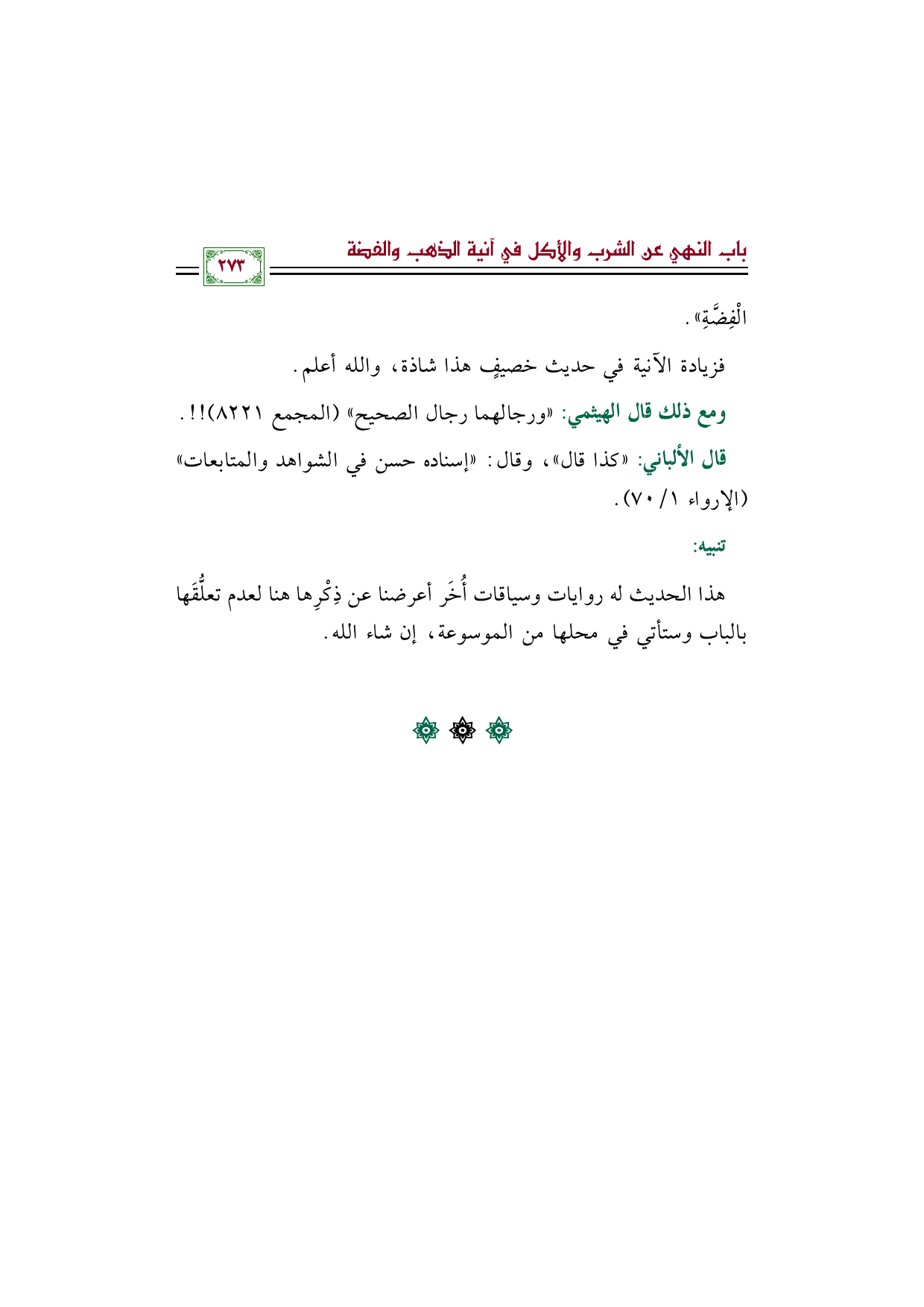 قال الألباني: ((كذا قال))، وقال: ((إسناده حسن في الشواهد والمتابعات)) (الإرواء ١/ ٧٠).