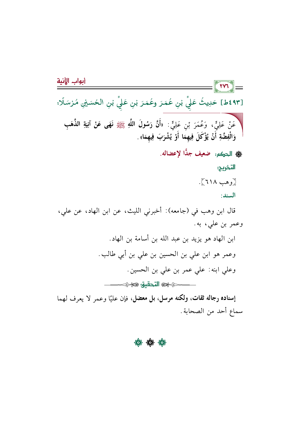 ٤٩٣ - حَدِيثُ عَلِيِّ بْنِ عُمَرَ وعُمَرَ بْنِ عَلِيِّ بْنِ الحُسَيْنِ مُرْسَلًا: