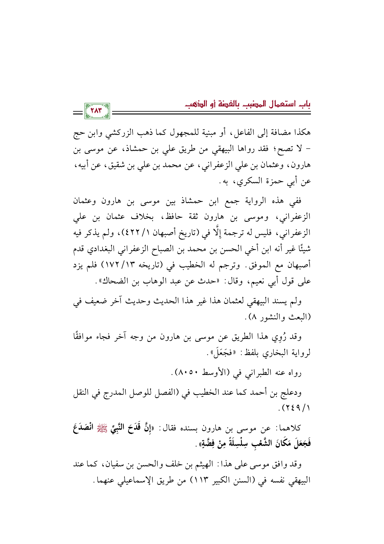 كلاهما: عن موسى بن هارون بسنده فقال: ((إِنَّ قَدَحَ النَّبِيِّ صلى الله عليه وسلم انْصَدَعَ فَجَعَلَ مَكَانَ الشَّعْبِ سِلْسِلَةً مِنْ فِضَّةٍ)).