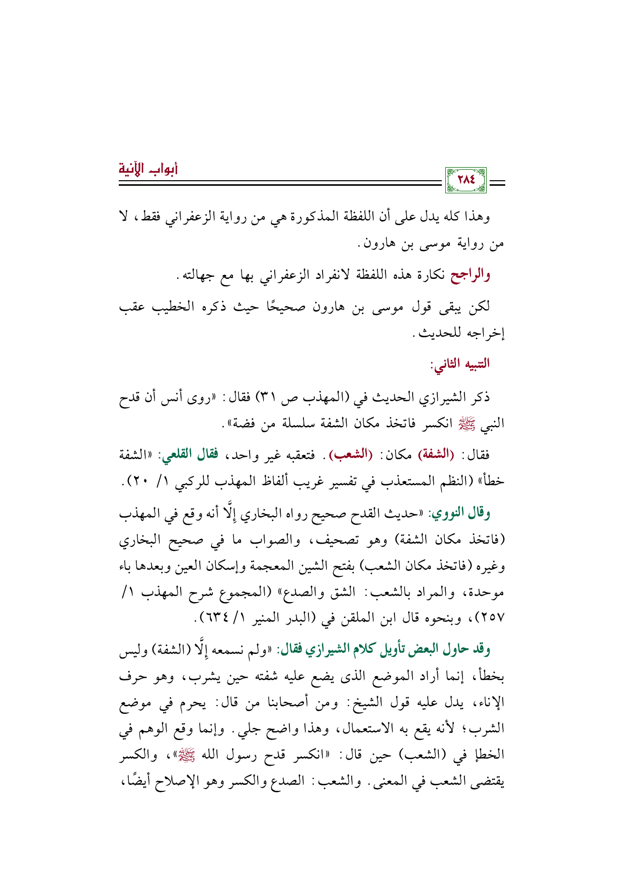 وقال النووي: ((حديث القدح صحيح رواه البخاري إِلَّا أنه وقع في المهذب (فاتخذ مكان الشفة) وهو تصحيف، والصواب ما في صحيح البخاري وغيره (فاتخذ مكان الشعب) بفتح الشين المعجمة وإسكان العين وبعدها باء موحدة، والمراد بالشعب: الشق والصدع)) (المجموع شرح المهذب ١/ ٢٥٧)، وبنحوه قال ابن الملقن في (البدر المنير ١/ ٦٣٤).