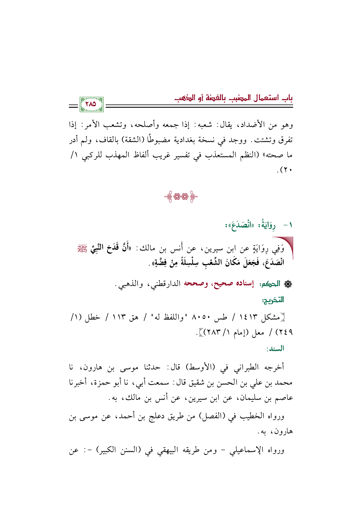 • وَفِي رِوَايَةٍ عن ابن سيرين، عن أَنس بن مالك: ((أَنَّ قَدَحَ النَّبِيِّ صلى الله عليه وسلم انْصَدَعَ، فَجَعَلَ مَكَانَ الشِّعْبِ سِلْسِلَةً مِنْ فِضَّةٍ)).