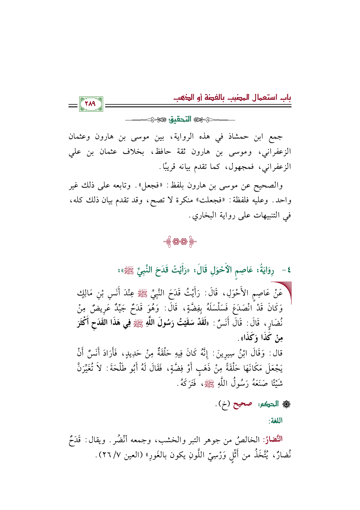 • عَنْ عَاصِمٍ الأَحْوَلِ، قَالَ: رَأَيْتُ قَدَحَ النَّبِيِّ صلى الله عليه وسلم عِنْدَ أَنَسِ بْنِ مَالِكٍ وَكَانَ قَدْ انْصَدَعَ فَسَلْسَلَهُ بِفِضَّةٍ، قَالَ: وَهُوَ قَدَحٌ جَيِّدٌ عَرِيضٌ مِنْ نُضَارٍ، قَالَ: قَالَ أَنَسٌ: ((لَقَدْ سَقَيْتُ رَسُولَ اللَّهِ صلى الله عليه وسلم فِي هَذَا القَدَحِ أَكْثَرَ مِنْ كَذَا وَكَذَا)).