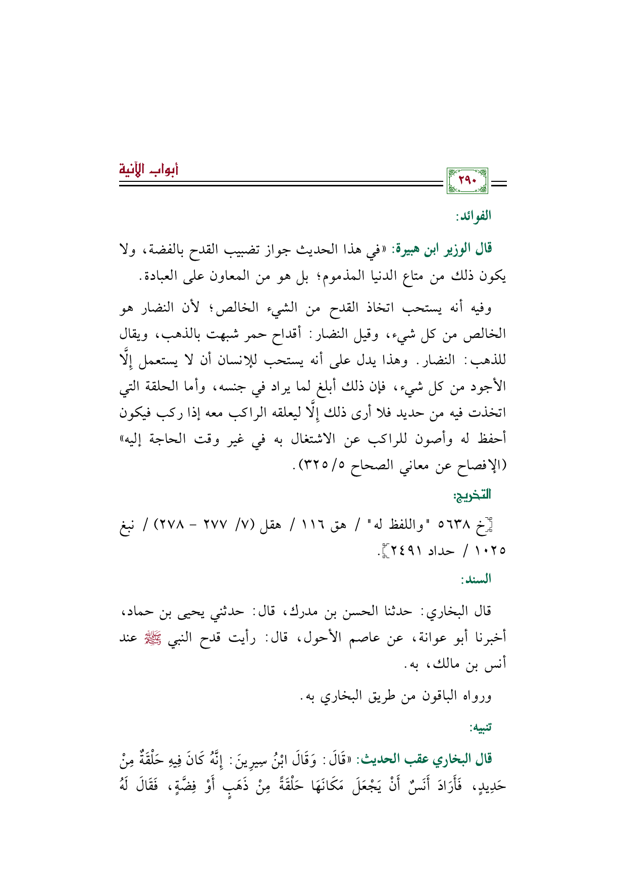 قال الوزير ابن هبيرة: ((في هذا الحديث جواز تضبيب القدح بالفضة، ولا يكون ذلك من متاع الدنيا المذموم؛ بل هو من المعاون على العبادة.