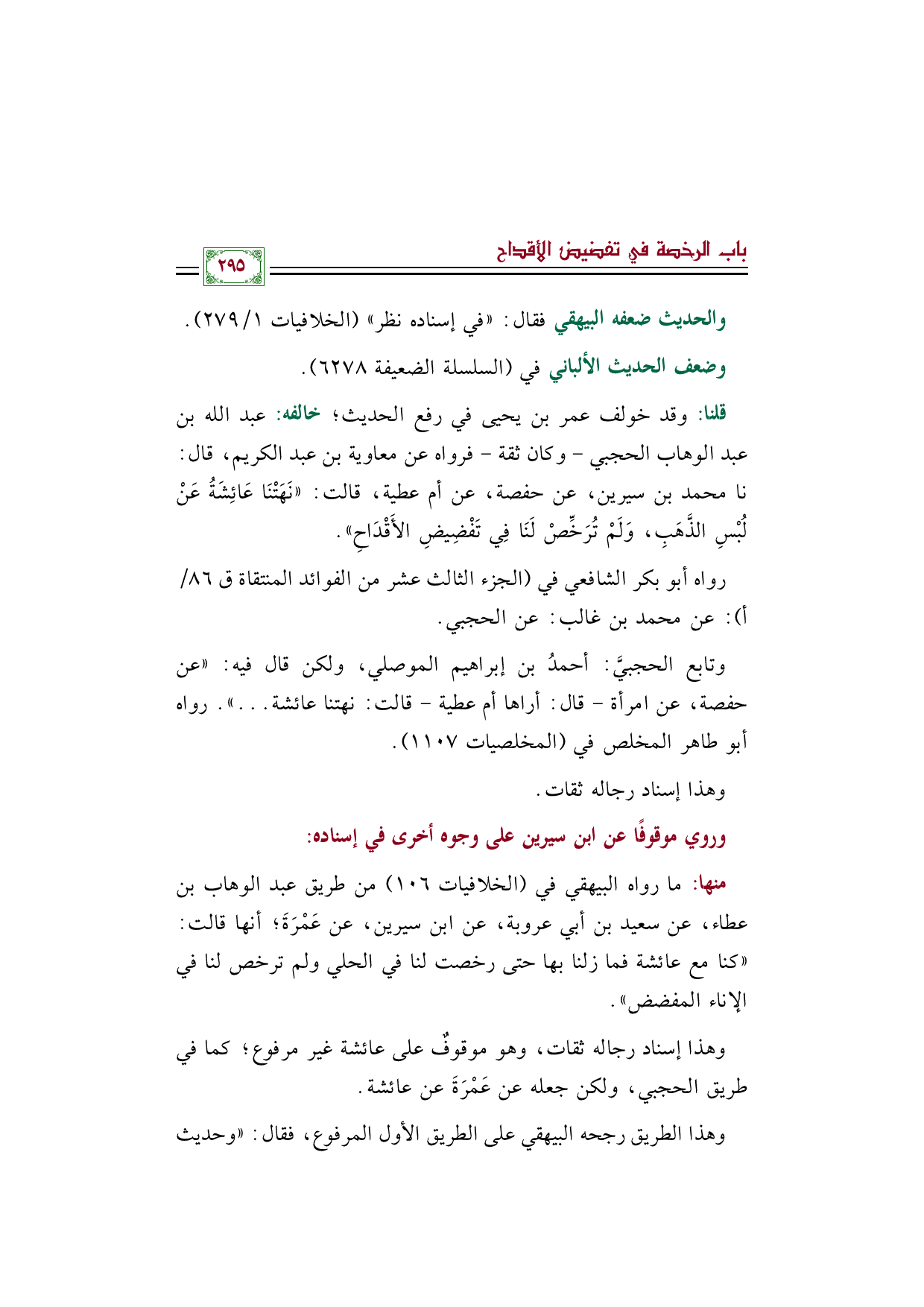 قلنا: وقد خولف عمر بن يحيى في رفع الحديث؛ خالفه: عبد الله بن عبد الوهاب الحجبي - وكان ثقة - فرواه عن معاوية بن عبد الكريم، قال: نا محمد بن سيرين، عن حفصة، عن أم عطية، قالت: ((نَهَتْنَا عَائِشَةُ عَنْ لُبْسِ الذَّهَبِ، وَلَمْ تُرَخِّصْ لَنَا فِي تَفْضِيضِ الأَقْدَاحِ)).