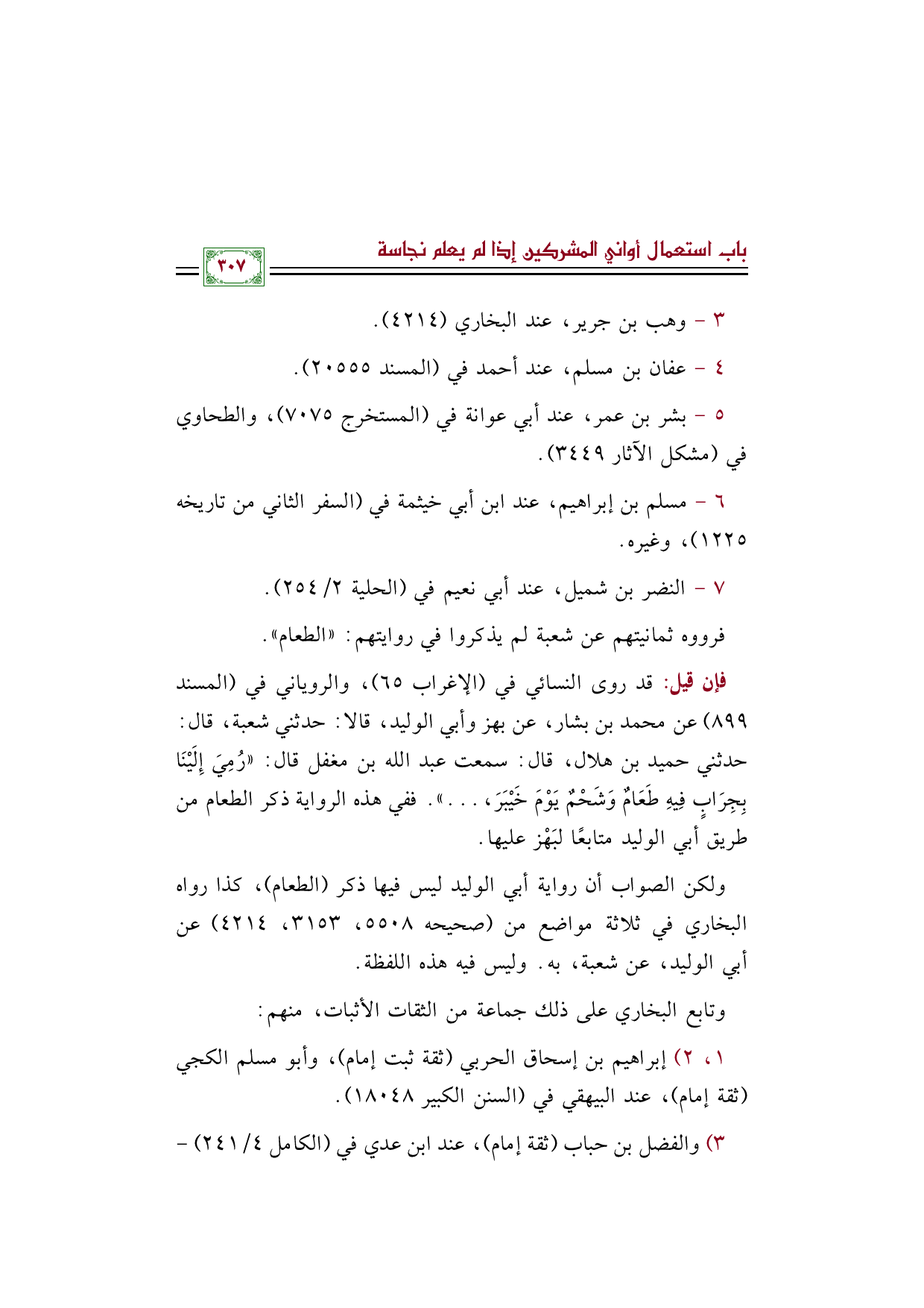 فإن قيل: قد روى النسائي في (الإغراب ٦٥)، والروياني في (المسند ٨٩٩) عن محمد بن بشار، عن بهز وأبي الوليد، قالا: حدثني شعبة، قال: حدثني حميد بن هلال، قال: سمعت عبد الله بن مغفل قال: ((رُمِيَ إِلَيْنَا بِجِرَابٍ فِيهِ طَعَامٌ وَشَحْمٌ يَوْمَ خَيْبَرَ، ... )). ففي هذه الرواية ذكر الطعام من طريق أبي الوليد متابعًا لبَهْز عليها.