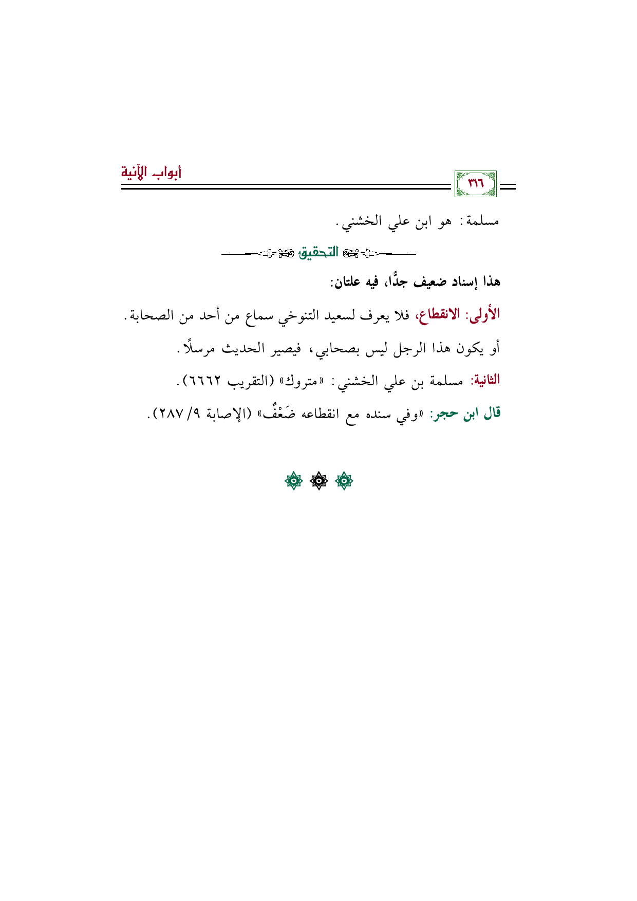 قال ابن حجر: ((وفي سنده مع انقطاعه ضَعْفٌ)) (الإصابة ٩/ ٢٨٧).