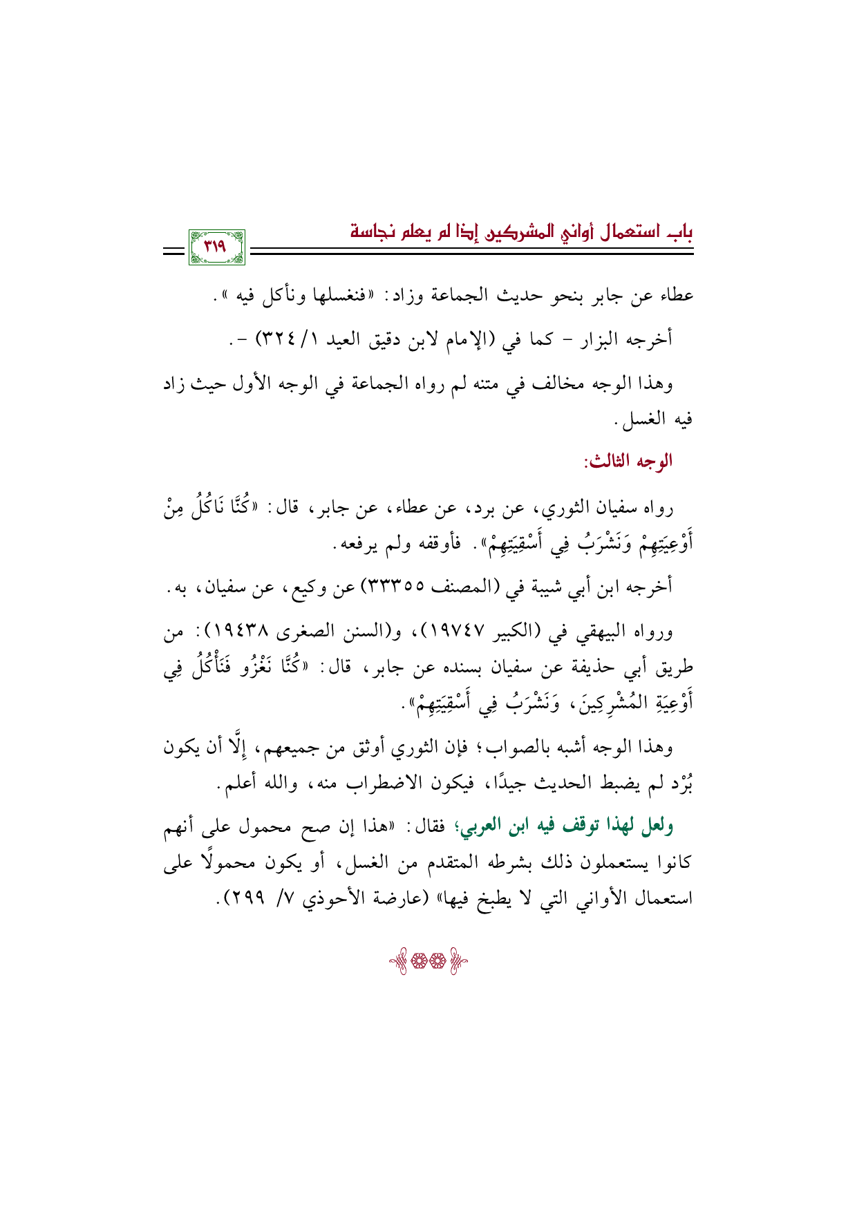رواه سفيان الثوري، عن برد، عن عطاء، عن جابر، قال: ((كُنَّا نَاكُلُ مِنْ أَوْعِيَتِهِمْ وَنَشْرَبُ فِي أَسْقِيَتِهِمْ)). فأوقفه ولم يرفعه.