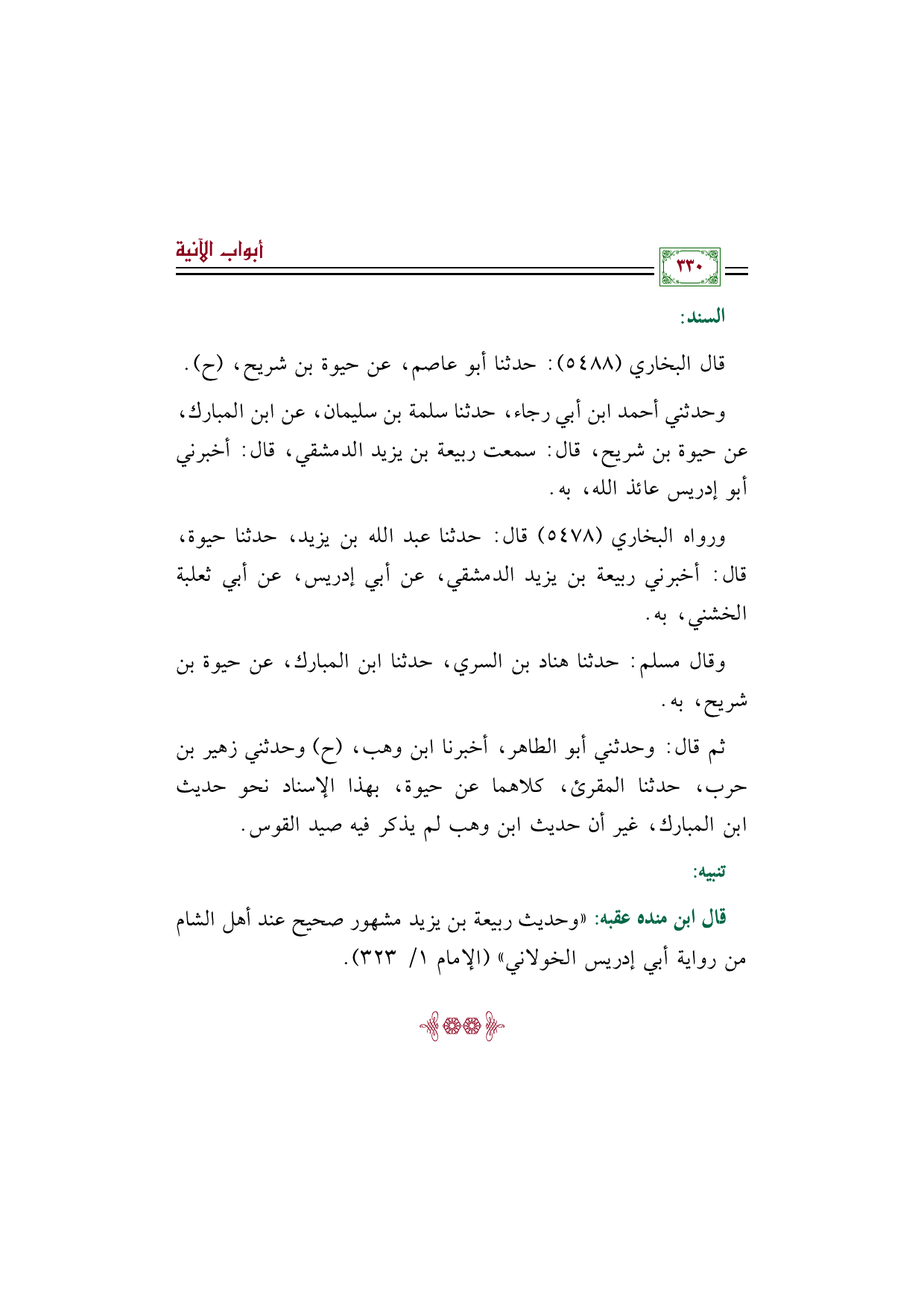 وحدثني أحمد ابن أبي رجاء، حدثنا سلمة بن سليمان، عن ابن المبارك، عن حيوة بن شريح، قال: سمعت ربيعة بن يزيد الدمشقي، قال: أخبرني أبو إدريس عائذ الله، به.