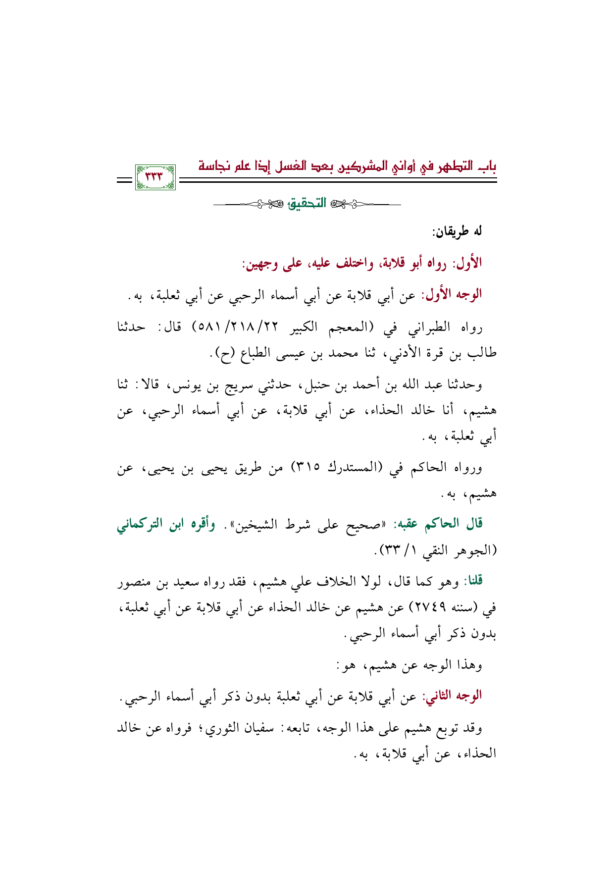 قلنا: وهو كما قال، لولا الخلاف علي هشيم، فقد رواه سعيد بن منصور في (سننه ٢٧٤٩) عن هشيم عن خالد الحذاء عن أبي قلابة عن أبي ثعلبة، بدون ذكر أبي أسماء الرحبي.