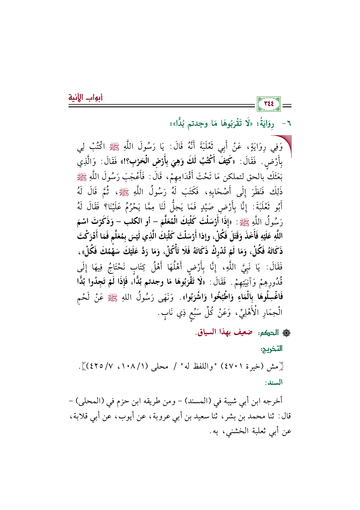 • وَفِي رِوَايَةٍ، عَنْ أَبِي ثَعْلَبَةَ أَنَّهُ قَالَ: يَا رَسُولَ اللَّهِ صلى الله عليه وسلم اكْتُبْ لِي بِأَرْضٍ. فَقَالَ: ((كَيْفَ أَكْتُبُ لَكَ وَهِيَ بِأَرْضِ الْحَرْبِ؟!)) فَقَالَ: وَالَّذِي بَعَثَكَ بالحق لتملكن مَا تَحْتَ أَقْدَامِهِمْ، قَالَ: فَأَعْجَبَ رَسُولَ اللَّهِ صلى الله عليه وسلم ذَلِكَ فَنَظَرَ إِلَى أَصْحَابِهِ، فَكَتَبَ لَهُ رَسُولُ اللَّهِ صلى الله عليه وسلم، ثُمَّ قَالَ لَهُ أَبُو ثَعْلَبَةَ: إِنَّا بِأَرْضِ صَيْدٍ فَمَا يَحِلُّ لَنَا مِمَّا يَحْرُمُ عَلَيْنَا؟ فَقَالَ لَهُ رَسُولُ اللَّهِ صلى الله عليه وسلم: ((إِذَا أَرْسَلْتَ كَلْبَكَ الْمُعَلَّمَ - أو الكلب - وَذَكَرْتَ اسْمَ اللَّهِ عَلَيْهِ فَأَخَذَ وَقَتَلَ فَكُلْ، وإذا أَرْسَلْتَ كَلْبَكَ الَّذِي لَيْسَ بِمُعَلَّمٍ فَمَا أَدْرَكْتَ ذَكَاتَهُ فَكُلْ، وَمَا لَمْ تُدْرِكْ ذَكَاتَهُ فَلَا تَأْكُلْ، وَمَا رَدَّ عَلَيْكَ سَهْمُكَ فَكُلْ))، فَقَالَ: يَا نَبِيَّ اللَّهِ، إِنَّا بِأَرْضٍ أَهْلُهَا أَهْلُ كِتَابٍ نَحْتَاجُ فِيهَا إِلَى قُدُورِهِمْ وَآنِيَتِهِمْ. فَقَالَ: ((لَا تَقْرَبُوهَا مَا وجدتم بُدًّا، فَإِذَا لَمْ تَجِدُوا بُدًّا فَاغْسِلُوهَا بِالْمَاءِ وَاطْبُخُوا وَاشْرَبُوا)). وَنَهَى رَسُولُ اللهِ صلى الله عليه وسلم عَنْ لَحْمِ الْحِمَارِ الْأَهْلِيِّ، وَعَنْ كُلِّ سَبُعٍ ذِي نَابٍ.