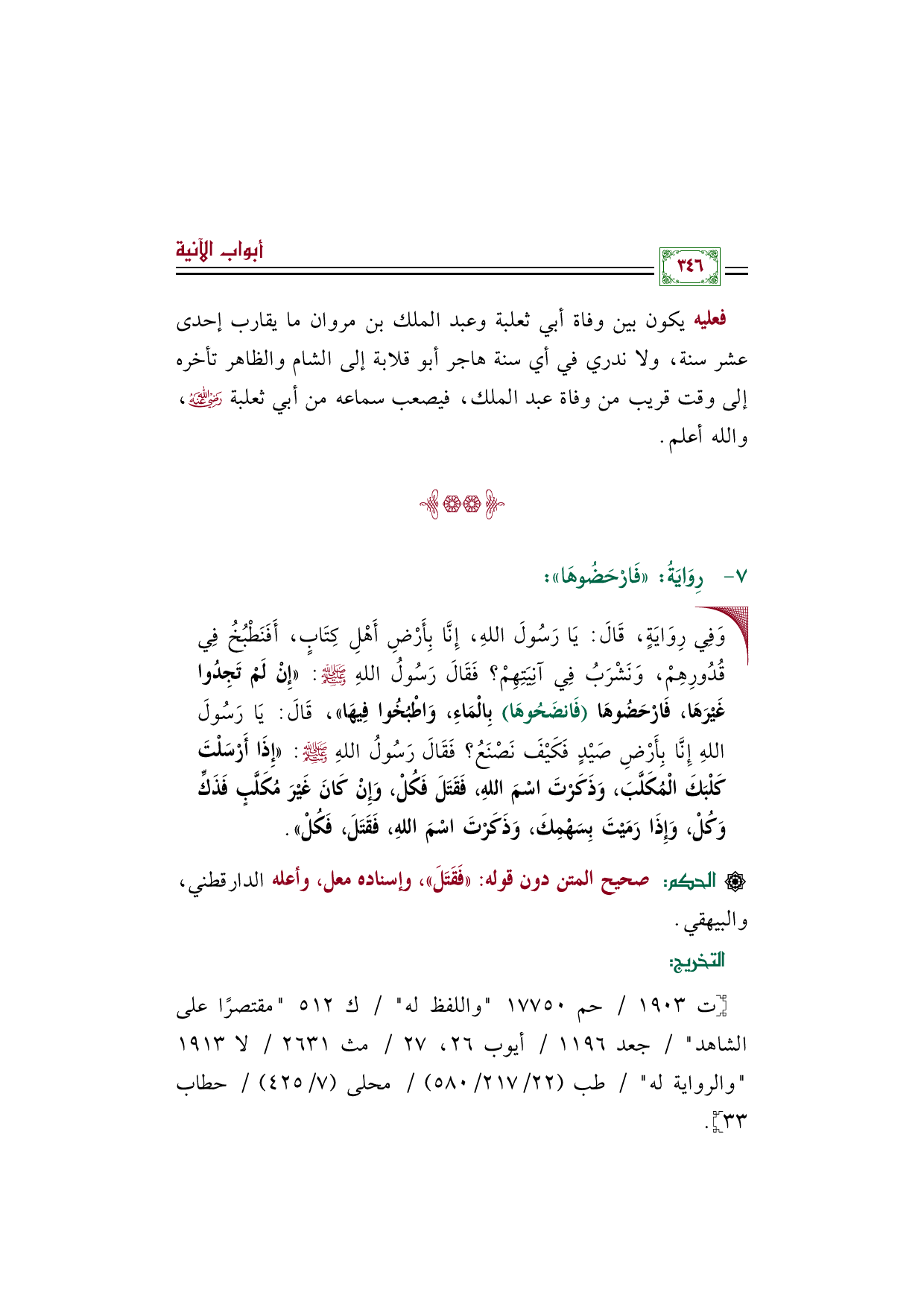 • وَفِي رِوَايَةٍ، قَالَ: يَا رَسُولَ اللهِ، إِنَّا بِأَرْضِ أَهْلِ كِتَابٍ، أَفَنَطْبُخُ فِي قُدُورِهِمْ، وَنَشْرَبُ فِي آنِيَتِهِمْ؟ فَقَالَ رَسُولُ اللهِ صلى الله عليه وسلم: ((إِنْ لَمْ تَجِدُوا غَيْرَهَا، فَارْحَضُوهَا (فَانضَحُوهَا) بِالْمَاءِ، وَاطْبُخُوا فِيهَا))، قَالَ: يَا رَسُولَ اللهِ إِنَّا بِأَرْضِ صَيْدٍ فَكَيْفَ نَصْنَعُ؟ فَقَالَ رَسُولُ اللهِ صلى الله عليه وسلم: ((إِذَا أَرْسَلْتَ كَلْبَكَ الْمُكَلَّبَ، وَذَكَرْتَ اسْمَ اللهِ، فَقَتَلَ فَكُلْ، وَإِنْ كَانَ غَيْرَ مُكَلَّبٍ فَذَكِّ وَكُلْ، وَإِذَا رَمَيْتَ بِسَهْمِكَ، وَذَكَرْتَ اسْمَ اللهِ، فَقَتَلَ، فَكُلْ)).