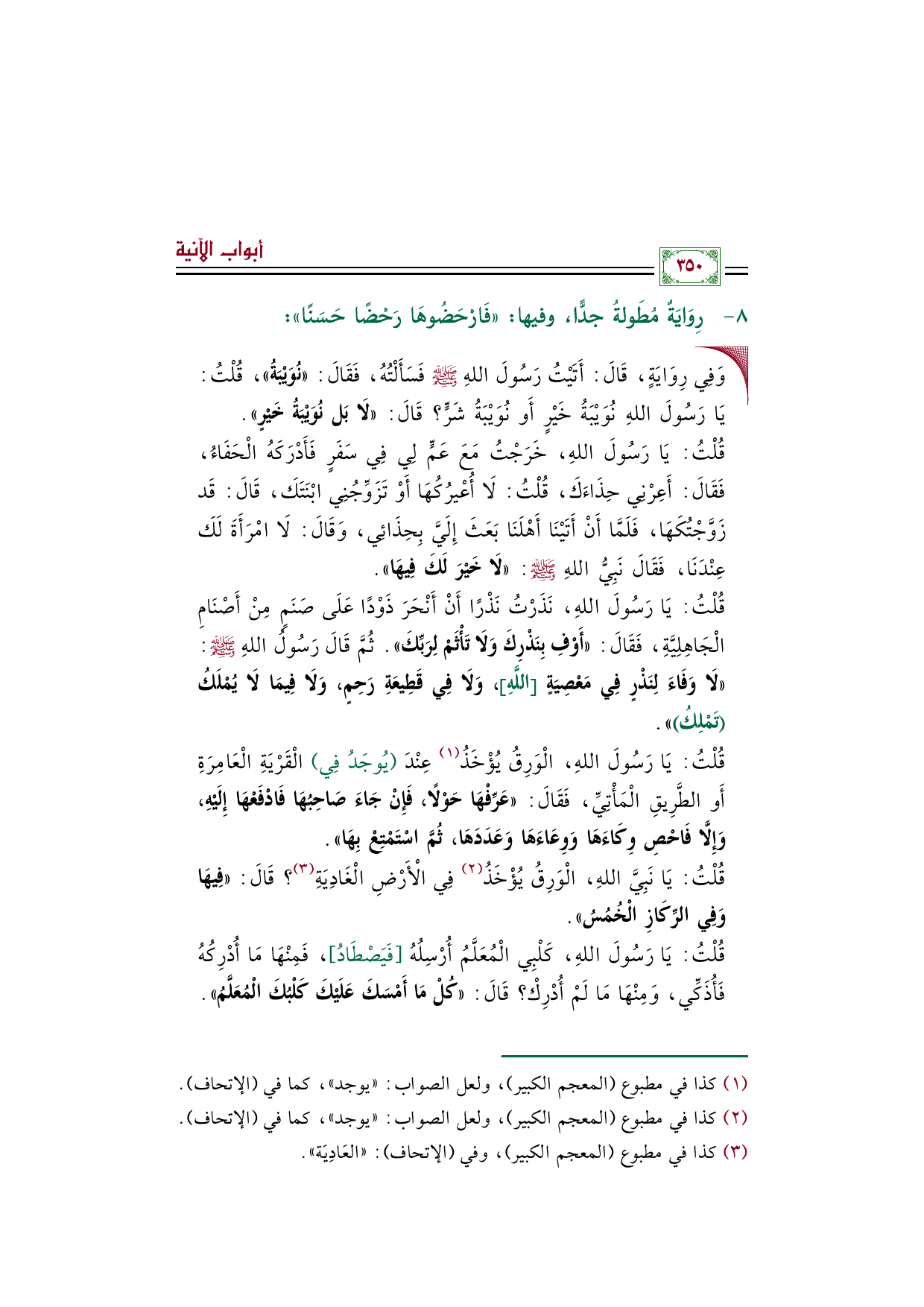• وَفِي رِوَايَةٍ، قَالَ: أَتَيْتُ رَسُولَ اللهِ صلى الله عليه وسلم فَسَأَلْتُهُ، فَقَالَ: ((نُوَيْبَةُ))، قُلْتُ: يَا رَسُولَ اللهِ نُوَيْبَةُ خَيْرٍ أَو نُوَيْبَةُ شَرٍّ؟ قَالَ: ((لَا بَل نُوَيْبَةُ خَيْرٍ)).