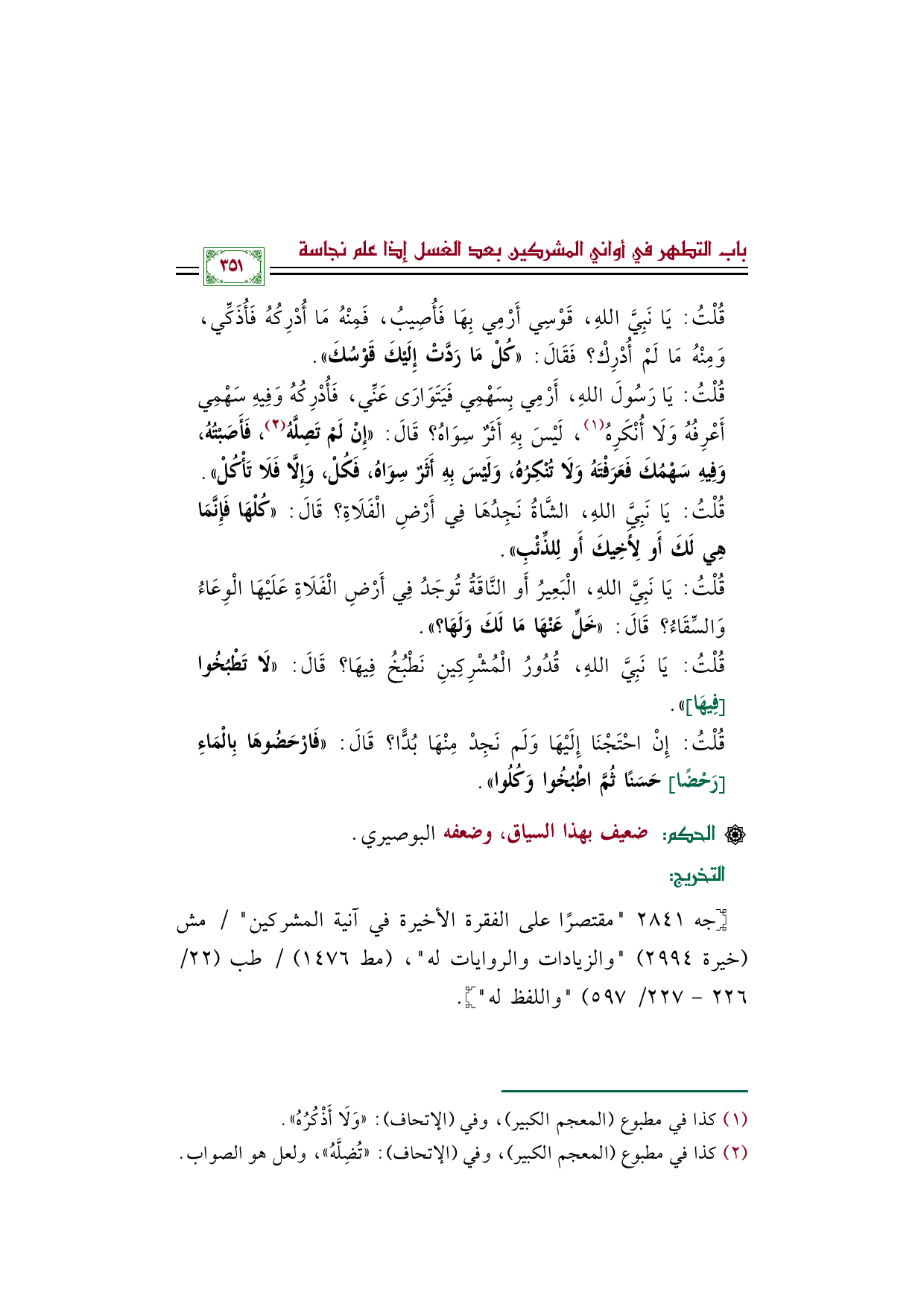[جه ٢٨٤١ "مقتصرًا على الفقرة الأخيرة في آنية المشركين" / مش (خيرة ٢٩٩٤) "والزيادات والروايات له"، (مط ١٤٧٦) / طب (٢٢/ ٢٢٦ - ٢٢٧/ ٥٩٧) "واللفظ له"].