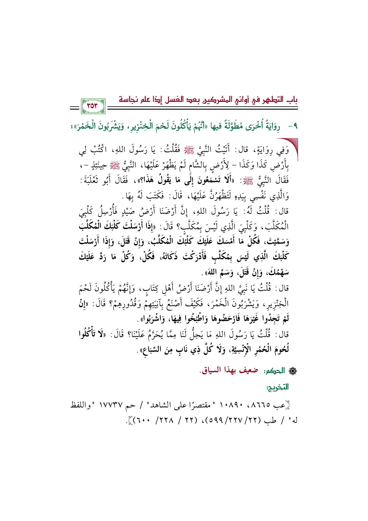 قال: قُلْتُ يَا نَبِيَّ اللهِ إِنَّ أَرْضَنَا أَرْضُ أَهْلِ كِتَابٍ، وَإِنَّهُمْ يَأْكُلُونَ لَحْمَ الْخِنْزِيرِ، وَيَشْرَبُونَ الْخَمْرَ، فَكَيْفَ أَصْنَعُ بِآنِيَتِهِمْ وَقُدُورِهِمْ؟ قَالَ: ((إِنْ لَمْ تَجِدُوا غَيْرَهَا فَارْحَضُوهَا وَاطْبُخُوا فِيهَا، وَاشْرَبُوا)).