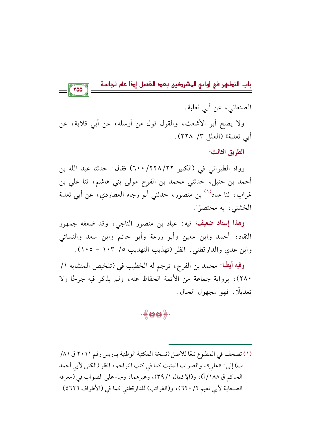 وفيه أيضًا: محمد بن الفرح، ترجم له الخطيب في (تلخيص المتشابه ١/ ٢٨٠)، برواية جماعة من الأئمة الحفاظ عنه، ولم يذكر فيه جرحًا ولا تعديلًا. فهو مجهول الحال.