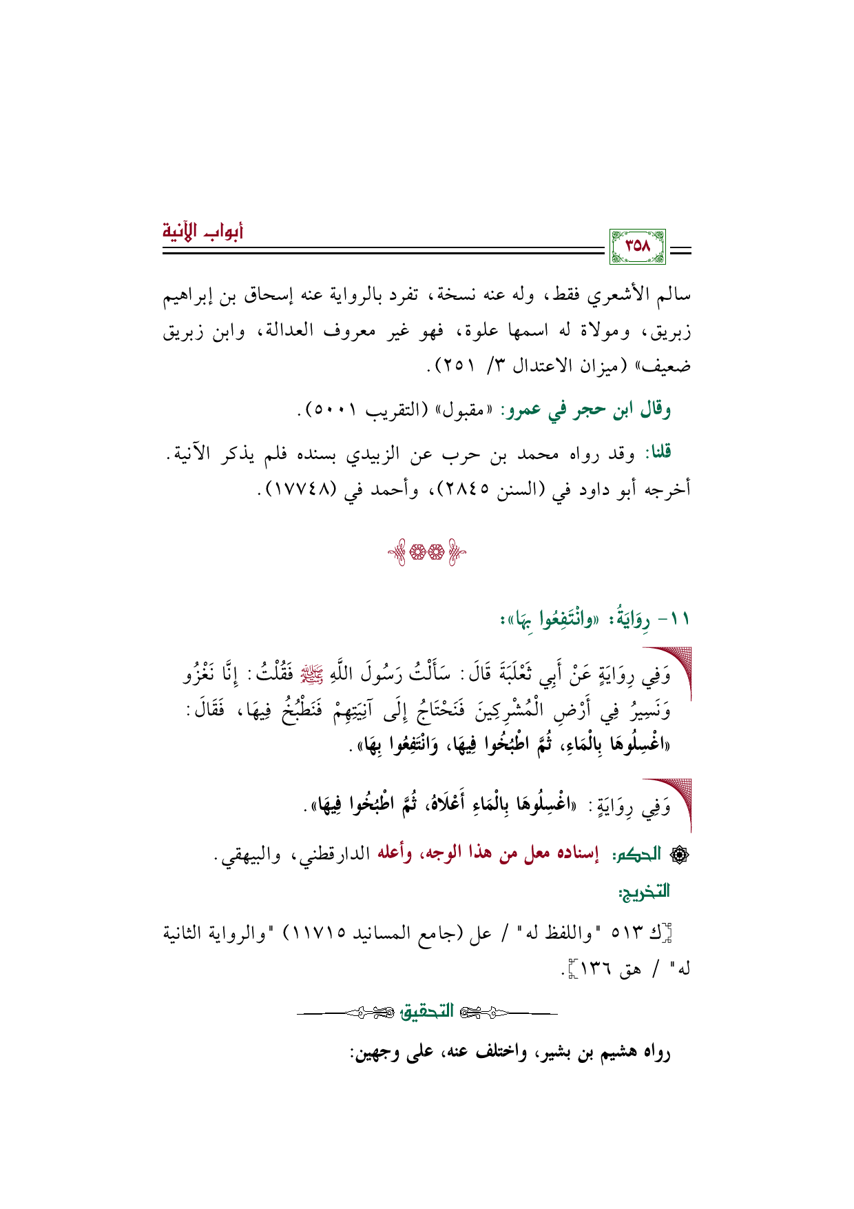 قلنا: وقد رواه محمد بن حرب عن الزبيدي بسنده فلم يذكر الآنية. أخرجه أبو داود في (السنن ٢٨٤٥)، وأحمد في (١٧٧٤٨).