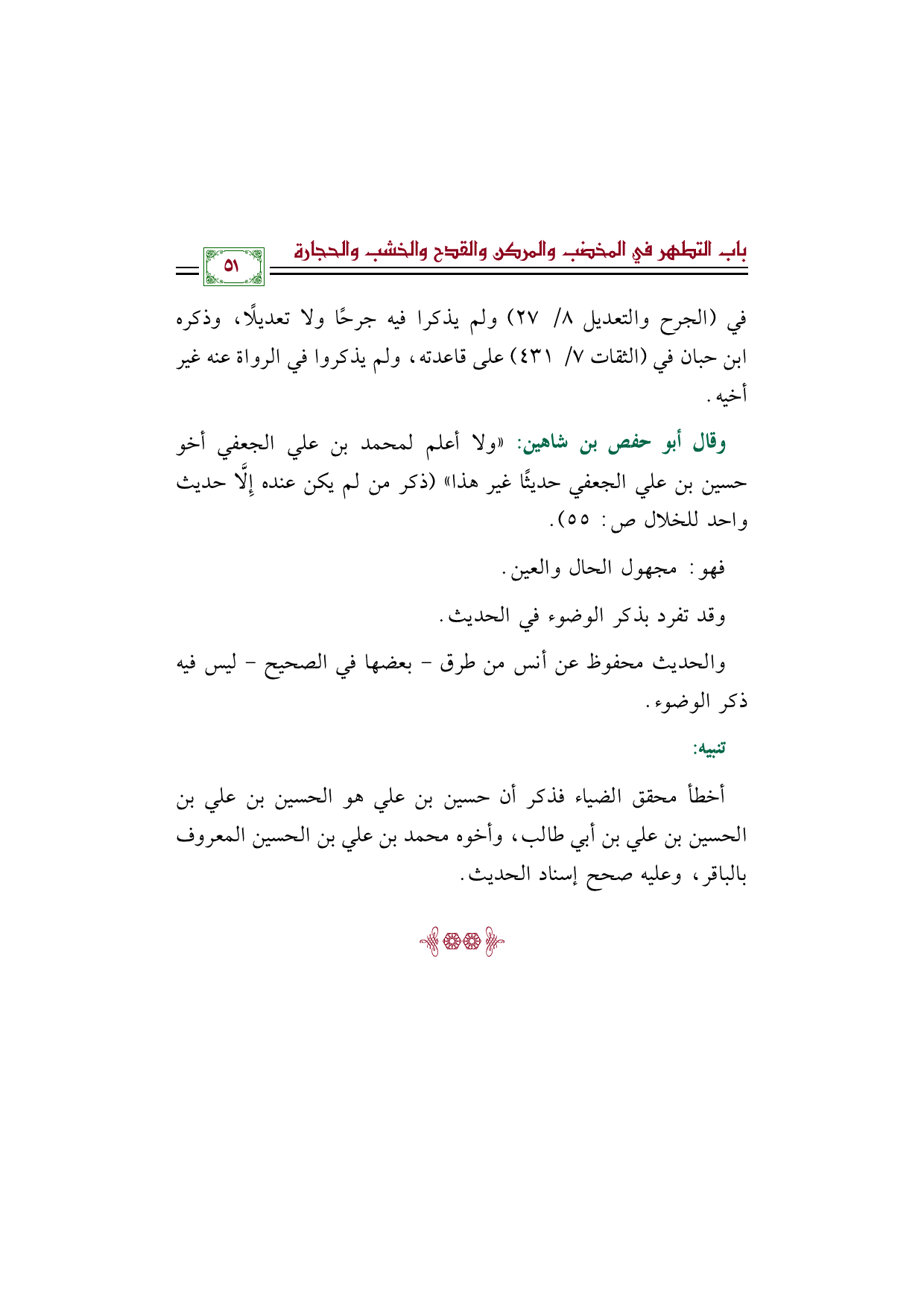 أخطأ محقق الضياء فذكر أن حسين بن علي هو الحسين بن علي بن الحسين بن علي بن أبي طالب، وأخوه محمد بن علي بن الحسين المعروف بالباقر، وعليه صحح إسناد الحديث.