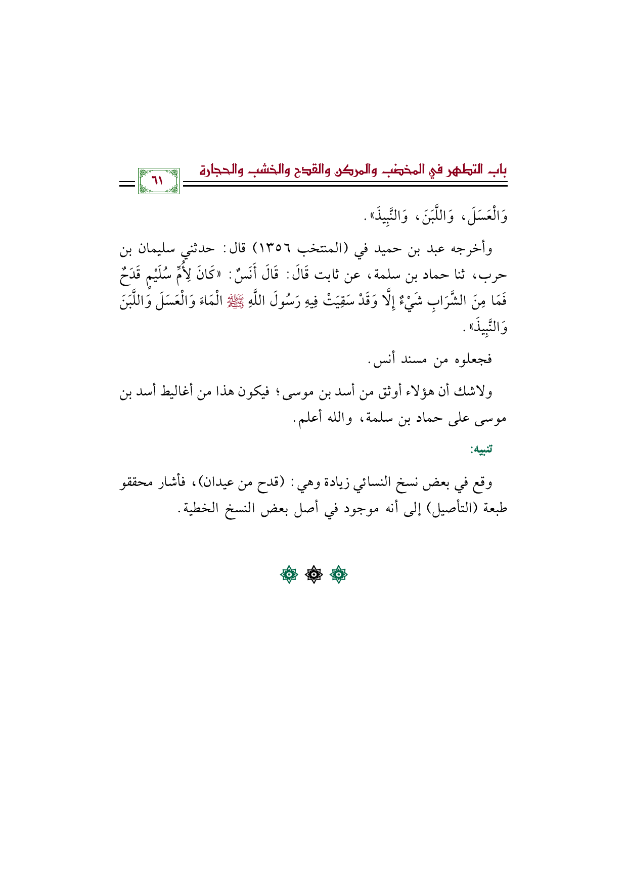 وقع في بعض نسخ النسائي زيادة وهي: (قدح من عيدان)، فأشار محققو طبعة (التأصيل) إلى أنه موجود في أصل بعض النسخ الخطية.