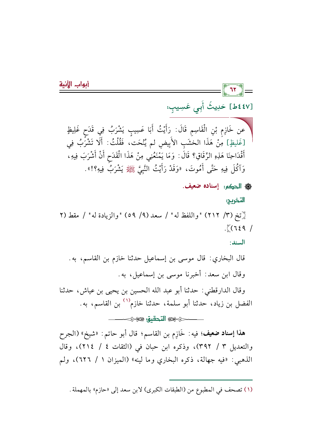 هذا إسناد ضعيف؛ فيه: خَازِم بن القاسم؛ قال أبو حاتم: ((شيخ)) (الجرح والتعديل ٣/ ٣٩٢)، وذكره ابن حبان في (الثقات ٤/ ٢١٤)، وقال الذهبي: ((فيه جهالة، ذكره البخاري وما لينه)) (الميزان ١/ ٦٢٦)، ولم