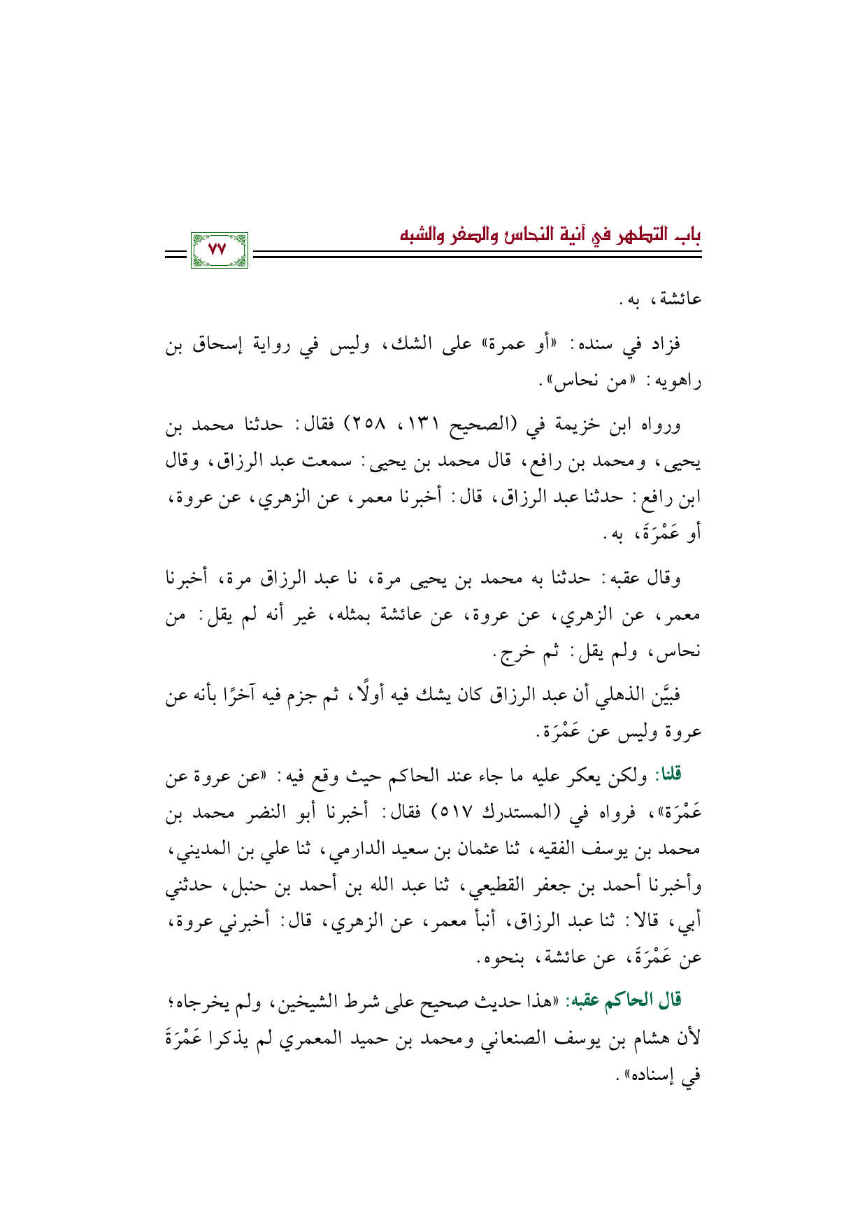 قلنا: ولكن يعكر عليه ما جاء عند الحاكم حيث وقع فيه: ((عن عروة عن عَمْرَة))، فرواه في (المستدرك ٥١٧) فقال: أخبرنا أبو النضر محمد بن محمد بن يوسف الفقيه، ثنا عثمان بن سعيد الدارمي، ثنا علي بن المديني، وأخبرنا أحمد بن جعفر القطيعي، ثنا عبد الله بن أحمد بن حنبل، حدثني أبي، قالا: ثنا عبد الرزاق، أنبأ معمر، عن الزهري، قال: أخبرني عروة، عن عَمْرَةَ، عن عائشة، بنحوه.