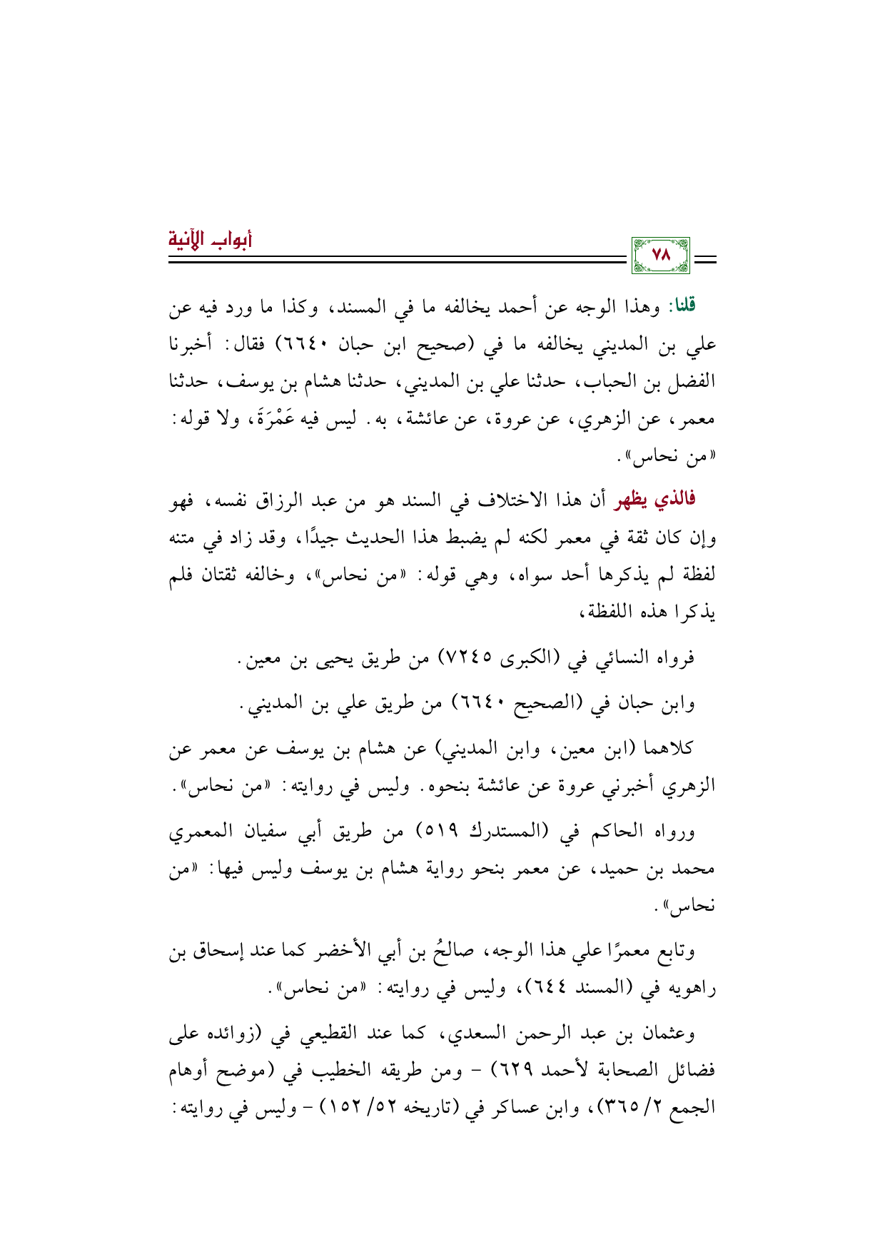 قلنا: وهذا الوجه عن أحمد يخالفه ما في المسند، وكذا ما ورد فيه عن علي بن المديني يخالفه ما في (صحيح ابن حبان ٦٦٤٠) فقال: أخبرنا الفضل بن الحباب، حدثنا علي بن المديني، حدثنا هشام بن يوسف، حدثنا معمر، عن الزهري، عن عروة، عن عائشة، به. ليس فيه عَمْرَةَ، ولا قوله: ((من نحاس)).