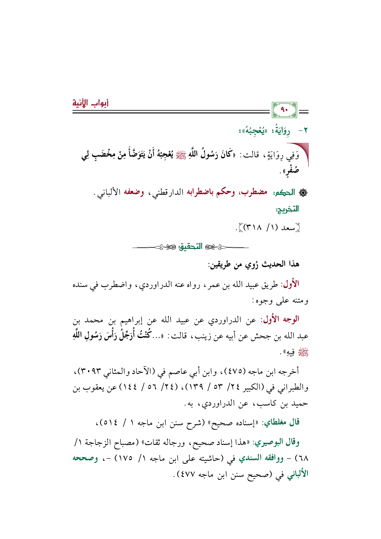 وقال البوصيري: ((هذا إسناد صحيح، ورجاله ثقات)) (مصباح الزجاجة ١/ ٦٨) - ووافقه السندي في (حاشيته على ابن ماجه ١/ ١٧٥) -، وصححه الألباني في (صحيح سنن ابن ماجه ٤٧٧).