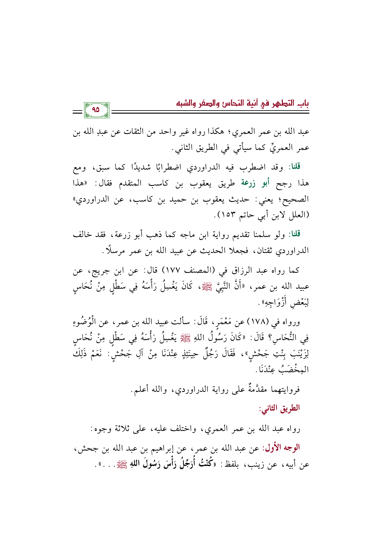 ورواه في (١٧٨) عن مَعْمَرٍ، قَالَ: سألت عبيد الله بن عمر، عن الْوُضُوءِ فِي النُّحَاسِ؟ قَالَ: ((كَانَ رَسُولُ اللهِ صلى الله عليه وسلم يَغْسِلُ رَأْسَهُ فِي سَطْلٍ مِنْ نُحَاسٍ لِزَيْنَبَ بِنْتِ جَحْشٍ))، فَقَالَ رَجُلٌ حِينَئِذٍ عِنْدَنَا مِنْ آلِ جَحْشٍ: نَعَمْ ذَلِكَ المِخْضَبُ عِنْدَنَا.