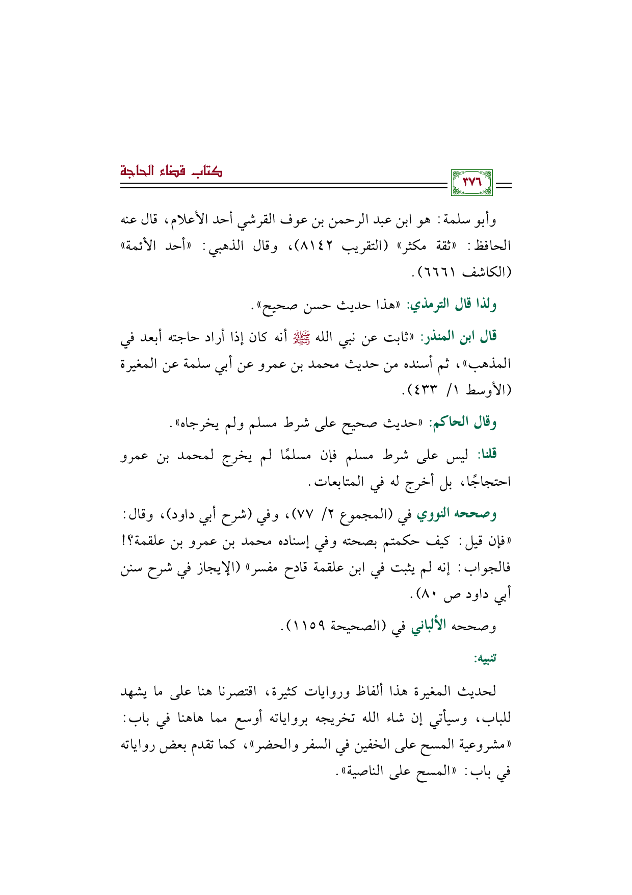 قال ابن المنذر: "ثابت عن نبي الله صلى الله عليه وسلم أنه كان إذا أراد حاجته أبعد في المذهب"، ثم أسنده من حديث محمد بن عمرو عن أبي سلمة عن المغيرة. (الأوسط ١/ ٤٣٣).