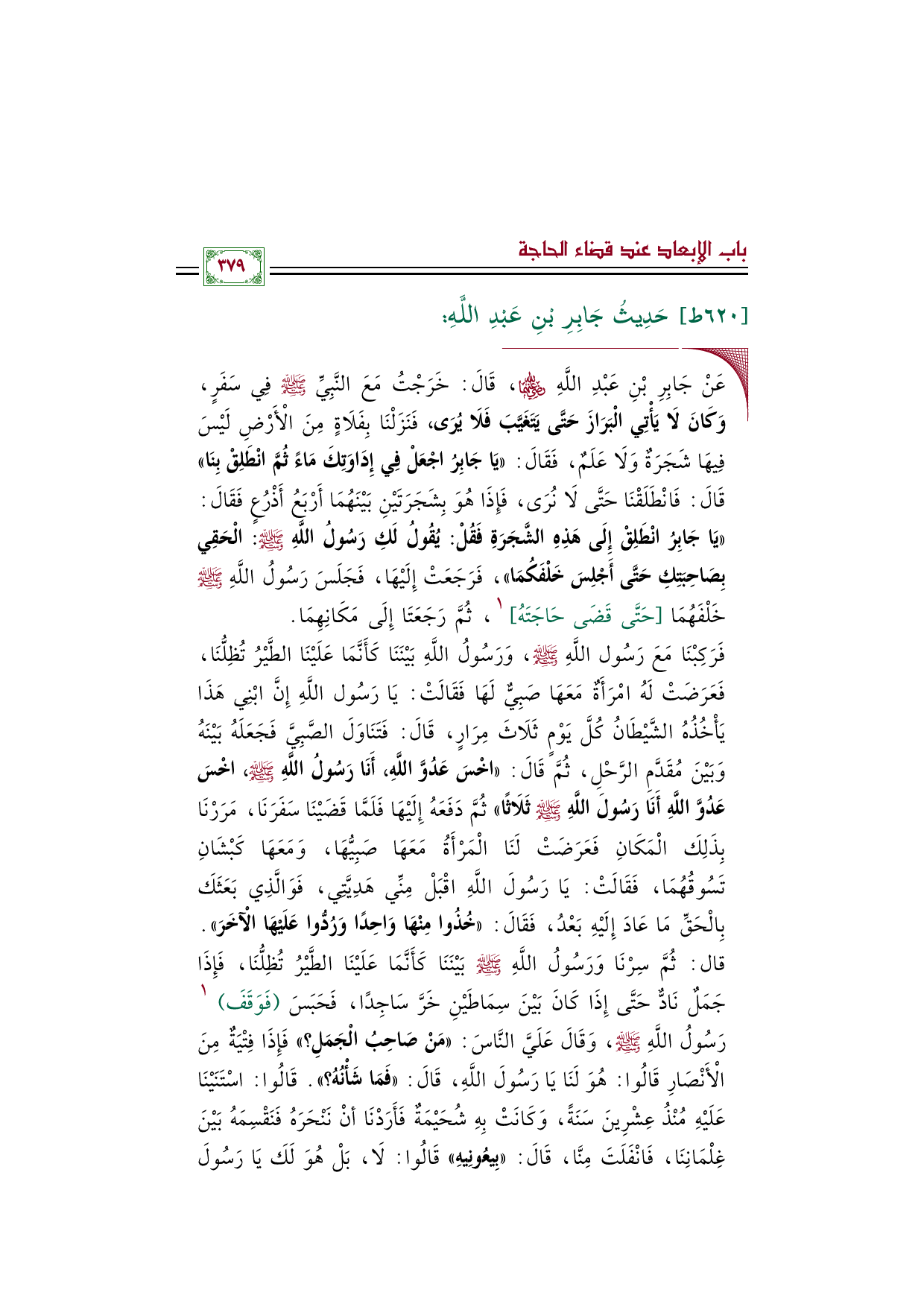 ◼ عَنْ جَابِرِ بْنِ عَبْدِ اللَّهِ رضي الله عنهما، قَالَ: خَرَجْتُ مَعَ النَّبِيِّ صَلَّى اللهُ عَلَيْهِ وَسَلَّمَ فِي سَفَرٍ، وَكَانَ لَا يَأْتِي الْبَرَازَ حَتَّى يَتَغَيَّبَ فَلَا يُرَى، فَنَزَلْنَا بِفَلَاةٍ مِنَ الْأَرْضِ لَيْسَ فِيهَا شَجَرَةٌ وَلَا عَلَمٌ، فَقَالَ: «يَا جَابِرُ اجْعَلْ فِي إِدَاوَتِكَ مَاءً ثُمَّ انْطَلِقْ بِنَا» قَالَ: فَانْطَلَقْنَا حَتَّى لَا نُرَى، فَإِذَا هُوَ بِشَجَرَتَيْنِ بَيْنَهُمَا أَرْبَعُ أَذْرُعٍ فَقَالَ: «يَا جَابِرُ انْطَلِقْ إِلَى هَذِهِ الشَّجَرَةِ فَقُلْ: يُقُولُ لَكِ رَسُولُ اللَّهِ صَلَّى اللهُ عَلَيْهِ وَسَلَّمَ: الْحَقِي بِصَاحِبَتِكِ حَتَّى أَجْلِسَ خَلْفَكُمَا»، فَرَجَعَتْ إِلَيْهَا، فَجَلَسَ رَسُولُ اللَّهِ صَلَّى اللهُ عَلَيْهِ وَسَلَّمَ خَلْفَهُمَا [حَتَّى قَضَى حَاجَتَهُ] ١، ثُمَّ رَجَعَتَا إِلَى مَكَانِهِمَا.