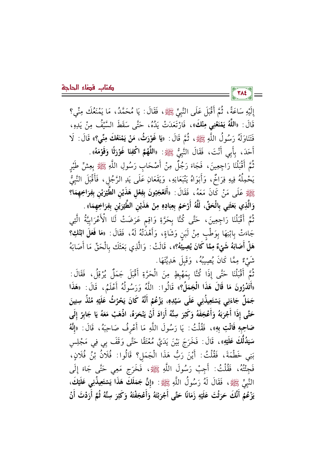 ثُمَّ أَقْبَلْنَا حَتَّى إِذَا كُنَّا بِمَهْبِطٍ مِنَ الْحَرَّةِ أَقْبَلَ جَمَلٌ يُرْقِلُ، فَقَالَ: «أَتَدْرُونَ مَا قَالَ هَذَا الْجَمَلُ؟ » قَالُوا: اللَّهُ وَرَسُولُهُ أَعْلَمُ، قَالَ: «هَذَا جَمَلٌ جَاءَنِي يَسْتَعِيذُنِي عَلَى سَيِّدِهِ، يَزْعُمُ أَنَّهُ كَانَ يَحْرُثُ عَلَيْهِ مُنْذُ سِنِينَ حَتَّى إِذَا أَجْرَبَهُ وَأَعْجَفَهُ وَكَبُرَ سِنُّهُ أَرَادَ أَنْ يَنْحَرَهُ، اذْهَبْ مَعَهُ يَا جَابِرُ إِلَى صَاحِبِهِ فَائْتِ بِهِ»، فَقُلْتُ: يَا رَسُولَ اللَّهِ مَا أَعْرِفُ صَاحِبَهُ، قَالَ: «إِنَّهُ سَيَدُلُّكَ عَلَيْهِ»، قَالَ: فَخَرَجَ بَيْنَ يَدَيَّ مُعْتَقًا حَتَّى وَقَفَ بِي فِي مَجْلِسِ بَنِي خَطْمَةَ، فَقُلْتُ: أَيْنَ رَبُّ هَذَا الْجَمَلِ؟ قَالُوا: فُلَانُ بْنُ فُلَانٍ، فَجِئْتُهُ، فَقُلْتُ: أَجِبْ رَسُولَ اللَّهِ صَلَّى اللهُ عَلَيْهِ وَسَلَّمَ، فَخَرَج مَعِي حَتَّى جَاءَ إِلَى النَّبِيِّ صَلَّى اللهُ عَلَيْهِ وَسَلَّمَ، فَقَالَ لَهُ رَسُولُ اللَّهِ صَلَّى اللهُ عَلَيْهِ وَسَلَّمَ: «إِنَّ جَمَلَكَ هَذَا يَسْتَعِيذُنِي عَلَيْكَ، يَزْعُمُ أَنَّكَ حَرَثْتَ عَلَيْهِ زَمَانًا حَتَّى أَجْرَبْتَهُ وَأَعْجَفْتَهُ وَكَبُرَ سِنُّهُ ثُمَّ أَرَدْتَ أَنْ
