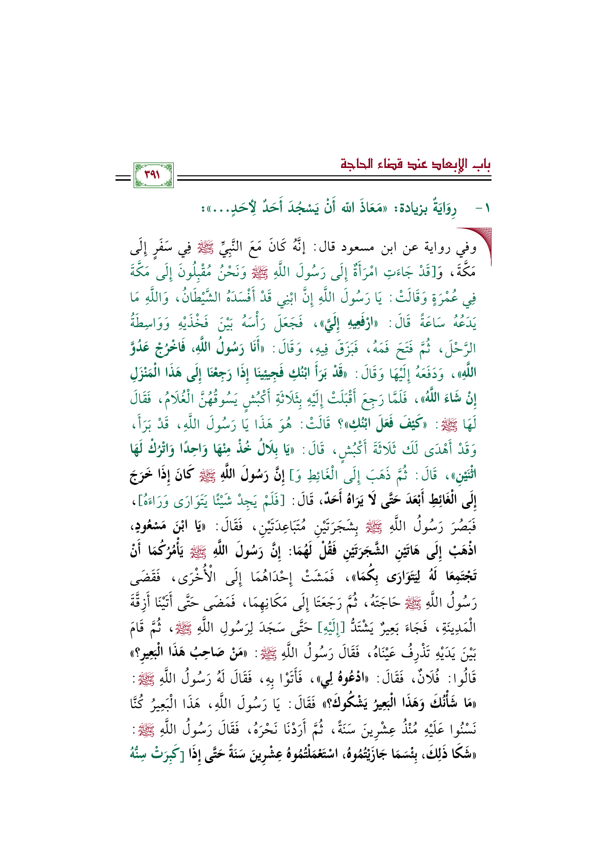 • وفي رواية عن ابن مسعود قال: إنَّهُ كَانَ مَعَ النَّبِيِّ صَلَّى اللهُ عَلَيْهِ وَسَلَّمَ فِي سَفَرٍ إِلَى مَكَّةَ، وَ [قَدْ جَاءَتِ امْرَأَةٌ إِلَى رَسُولَ اللَّهِ صَلَّى اللَّهُ عَلَيْهِ وَسَلَّمَ وَنَحْنُ مُقْبِلُونَ إِلَى مَكَّةَ فِي عُمْرَةٍ وَقَالَتْ: يَا رَسُولَ اللَّهِ إِنَّ ابْنِي قَدْ أَفْسَدَهُ الشَّيْطَانُ، وَاللَّهِ مَا يَدَعُهُ سَاعَةً قَالَ: «ارْفَعِيهِ إِلَيَّ»، فَجَعَلَ رَأْسَهُ بَيْنَ فَخْذَيْهِ وَوَاسِطَةُ الرَّحْلَ، ثُمَّ فَتَحَ فَمَهُ، فَبَزَقَ فِيهِ، وَقَالَ: «أَنَا رَسُولُ اللَّهِ، فَاخْرُجْ عَدُوَّ اللَّهِ»، وَدَفَعَهُ إِلَيْهَا وَقَالَ: «قَدْ بَرَأَ ابْنُكِ فَجِيئِينَا إِذَا رَجِعْنَا إِلَى هَذَا الْمَنْزَلِ إِنْ شَاءَ اللَّهُ»، فَلَمَّا رَجِعَ أَقْبَلَتْ إِلَيْهِ بِثَلَاثَةِ أَكْبُشٍ يَسُوقُهُنَّ الْغُلَامُ، فَقَالَ لَهَا صلى الله عليه وسلم: «كَيْفَ فَعَلَ ابْنُكِ»؟ قَالَتْ: هُوَ هَذَا يَا رَسُولَ اللَّهِ، قَدْ بَرَأَ، وَقَدْ أَهْدَى لَكَ ثَلَاثَةَ أَكْبُشٍ، قَالَ: «يَا بِلَالُ خُذْ مِنْهَا وَاحِدًا وَاتْرُكْ لَهَا اثْنَيْنِ»، قَالَ: ثُمَّ ذَهَبَ إِلَى الْغَائِطِ وَ] إِنَّ رَسُولَ اللَّهِ صَلَّى اللهُ عَلَيْهِ وَسَلَّمَ كَانَ إِذَا خَرَجَ إِلَى الْغَائِطِ أَبْعَدَ حَتَّى لَا يَرَاهُ أَحَدٌ، قَالَ: [فَلَمْ يَجِدْ شَيْئًا يَتَوَارَى وَرَاءَهُ]، فَبَصُرَ رَسُولُ اللَّهِ صَلَّى اللهُ عَلَيْهِ وَسَلَّمَ بِشَجَرَتَيْنِ مُتَبَاعِدَتَيْنِ، فَقَالَ: «يَا ابْنَ مَسْعُودٍ، اذْهَبْ إِلَى هَاتَيْنِ الشَّجَرَتَيْنِ فَقُلْ لَهُمَا: إِنَّ رَسُولَ اللَّهِ صَلَّى اللهُ عَلَيْهِ وَسَلَّمَ يَأْمُرُكُمَا أَنْ تَجْتَمِعَا لَهُ لِيَتَوَارَى بِكُمَا»، فَمَشَتْ إِحْدَاهُمَا إِلَى الْأُخْرَى، فَقَضَى رَسُولُ اللَّهِ صَلَّى اللهُ عَلَيْهِ وَسَلَّمَ حَاجَتَهُ، ثُمَّ رَجَعَتَا إِلَى مَكَانِهِمَا، فَمَضَى حَتَّى أَتَيْنَا أَزِقَّةَ الْمَدِينَةِ، فَجَاءَ بَعِيرٌ يَشْتَدُّ [إِلَيْهِ] حَتَّى سَجَدَ لِرَسُولِ اللَّهِ صَلَّى اللهُ عَلَيْهِ وَسَلَّمَ، ثُمَّ قَامَ بَيْنَ يَدَيْهِ تَذْرِفُ عَيْنَاهُ، فَقَالَ رَسُولُ اللَّهِ صَلَّى اللهُ عَلَيْهِ وَسَلَّمَ: «مَنْ صَاحِبُ هَذَا الْبَعِيرِ؟» قَالُوا: فُلَانٌ، فَقَالَ: «ادْعُوهُ لِي»، فَأَتَوْا بِهِ، فَقَالَ لَهُ رَسُولُ اللَّهِ صَلَّى اللهُ عَلَيْهِ وَسَلَّمَ: «مَا شَأْنُكَ وَهَذَا الْبَعِيرُ يَشْكُوكَ؟» فَقَالَ: يَا رَسُولَ اللَّهِ، هَذَا الْبَعِيرُ كُنَّا نَسْنُوا عَلَيْهِ مُنْذُ عِشْرِينَ سَنَةً، ثُمَّ أَرَدْنَا نَحْرَهُ، فَقَالَ رَسُولُ اللَّهِ صَلَّى اللهُ عَلَيْهِ وَسَلَّمَ: «شَكَا ذَلِكَ، بِئْسَمَا جَازَيْتُمُوهُ، اسْتَعْمَلْتُمُوهُ عِشْرِينَ سَنَةً حَتَّى إِذَا [كَبِرَتْ سِنُّهُ