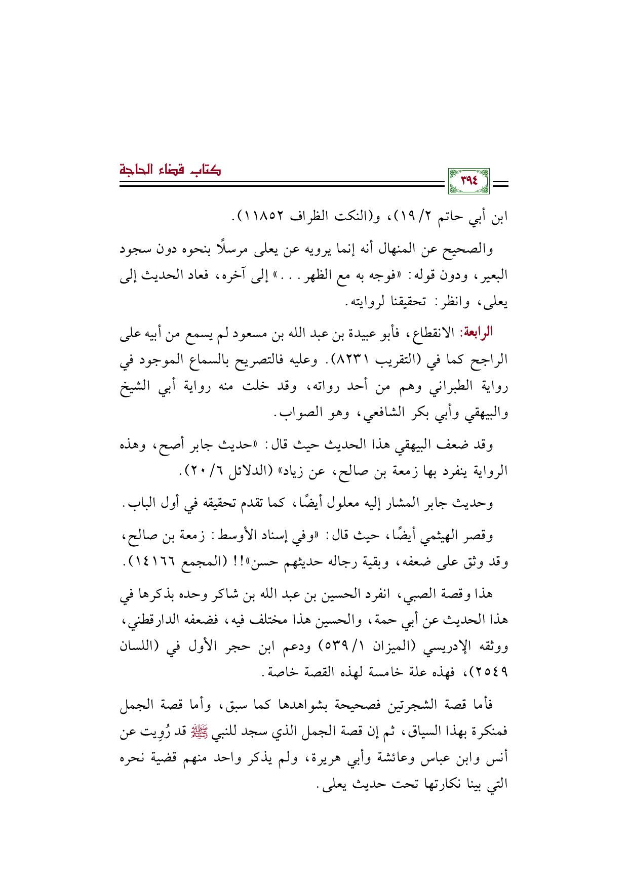 الرابعة: الانقطاع، فأبو عبيدة بن عبد الله بن مسعود لم يسمع من أبيه على الراجح كما في (التقريب ٨٢٣١). وعليه فالتصريح بالسماع الموجود في رواية الطبراني وهم من أحد رواته، وقد خلت منه رواية أبي الشيخ والبيهقي وأبي بكر الشافعي، وهو الصواب.