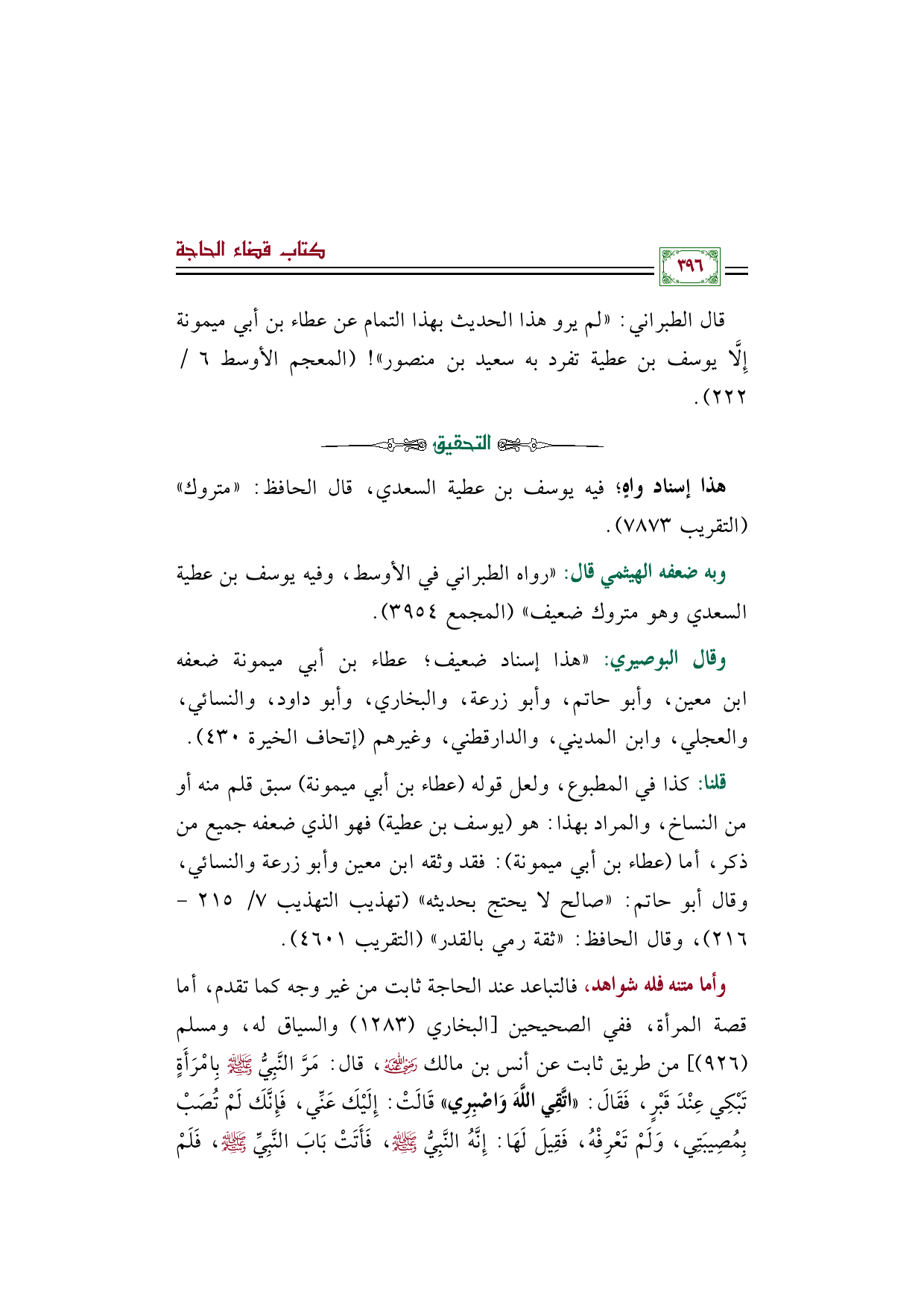وأما متنه فله شواهد، فالتباعد عند الحاجة ثابت من غير وجه كما تقدم، أما قصة المرأة، ففي الصحيحين [البخاري (١٢٨٣) والسياق له، ومسلم (٩٢٦)] من طريق ثابت عن أنس بن مالك رضي الله عنه، قال: مَرَّ النَّبِيُّ صَلَّى اللهُ عَلَيْهِ وَسَلَّمَ بِامْرَأَةٍ تَبْكِي عِنْدَ قَبْرٍ، فَقَالَ: «اتَّقِي اللَّهَ وَاصْبِرِي» قَالَتْ: إِلَيْكَ عَنِّي، فَإِنَّكَ لَمْ تُصَبْ بِمُصِيبَتِي، وَلَمْ تَعْرِفْهُ، فَقِيلَ لَهَا: إِنَّهُ النَّبِيُّ صَلَّى اللهُ عَلَيْهِ وَسَلَّمَ، فَأَتَتْ بَابَ النَّبِيِّ صَلَّى اللهُ عَلَيْهِ وَسَلَّمَ، فَلَمْ