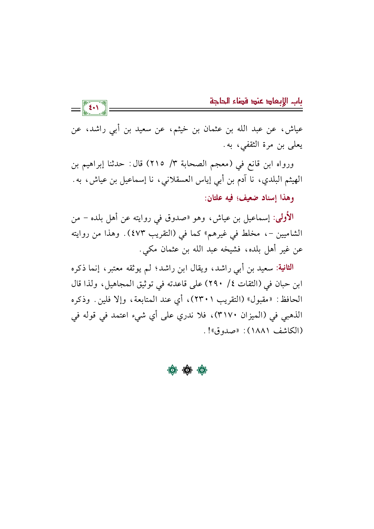الأولى: إسماعيل بن عياش، وهو "صدوق في روايته عن أهل بلده - من الشاميين -، مخلط في غيرهم" كما في (التقريب ٤٧٣). وهذا من روايته عن غير أهل بلده، فشيخه عبد الله بن عثمان مكي.