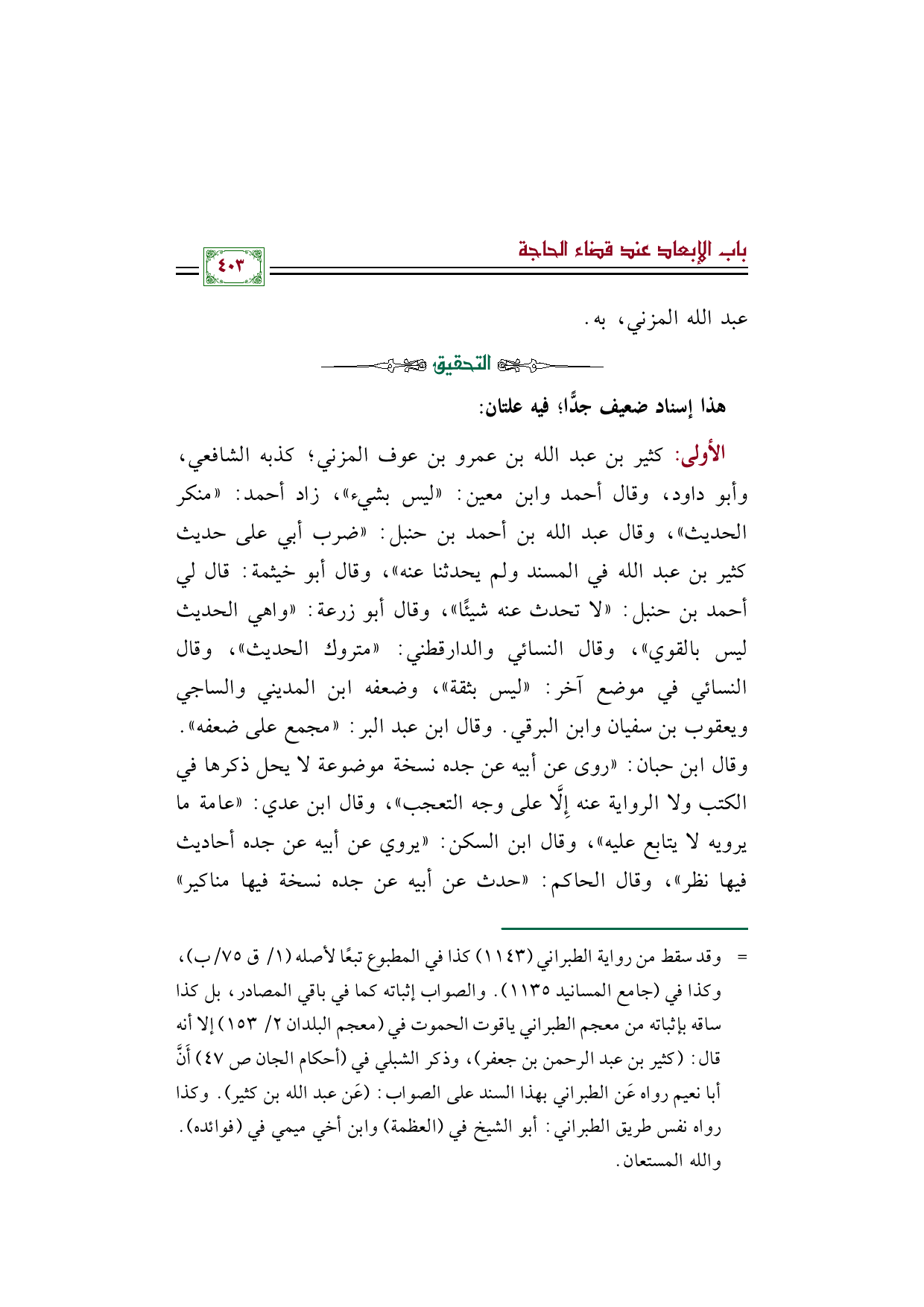 الأولى: كثير بن عبد الله بن عمرو بن عوف المزني؛ كذبه الشافعي، وأبو داود، وقال أحمد وابن معين: "ليس بشيء"، زاد أحمد: "منكر الحديث"، وقال عبد الله بن أحمد بن حنبل: "ضرب أبي على حديث كثير بن عبد الله في المسند ولم يحدثنا عنه"، وقال أبو خيثمة: قال لي أحمد بن حنبل: "لا تحدث عنه شيئًا"، وقال أبو زرعة: "واهي الحديث ليس بالقوي"، وقال النسائي والدارقطني: "متروك الحديث"، وقال النسائي في موضع آخر: "ليس بثقة"، وضعفه ابن المديني والساجي ويعقوب بن سفيان وابن البرقي. وقال ابن عبد البر: "مجمع على ضعفه". وقال ابن حبان: "روى عن أبيه عن جده نسخة موضوعة لا يحل ذكرها في الكتب ولا الرواية عنه إِلَّا على وجه التعجب"، وقال ابن عدي: "عامة ما يرويه لا يتابع عليه"، وقال ابن السكن: "يروي عن أبيه عن جده أحاديث فيها نظر"، وقال الحاكم: "حدث عن أبيه عن جده نسخة فيها مناكير"